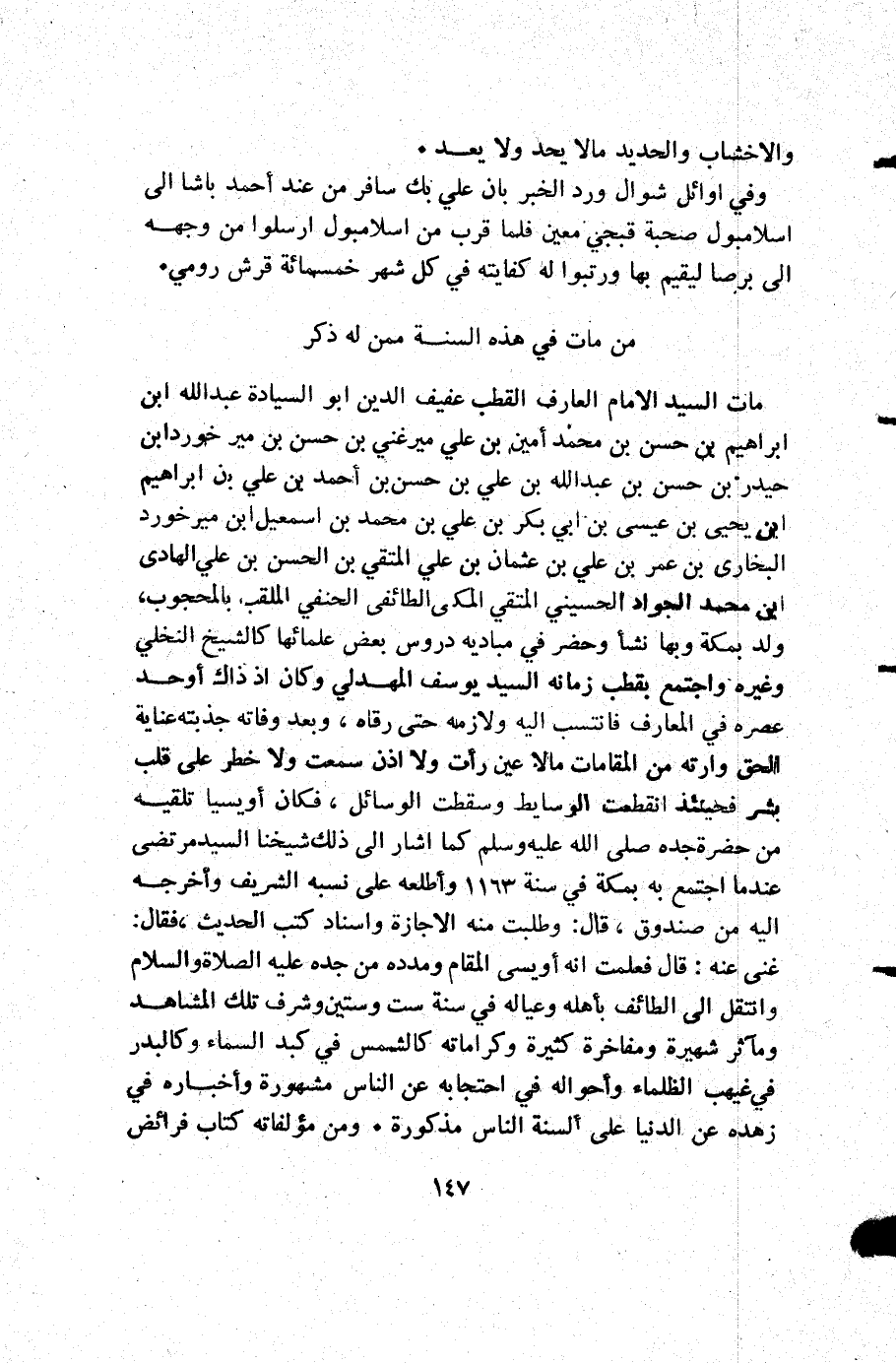 مات السيد الإمام العارف القطب عفيف الدين أبو السيادة عبد الله ابن إبراهيم بن حسن بن محمد امين بن علي ميرغني بن حسن بن مير خوردابن حيدر بن حسن بن عبد الله بن علي بن حسن بن أحمد بن علي بن إبراهيم ابن يحيى بن عيسى بن أبي بكر بن علي بن محمد بن إسمعيل ابن ميرخورد البخاري بن عمر بن علي بن عثمان بن علي المتقي بن الحسن بن علي الهادي ابن محمدالجوار الحسيني المتقي المكي الطائفي الحنفي الملقب بالمحجوب ولد بمكة وبها نشأ وحضر في مباديه دروس بعض علمائها كالشيخ النخلي وغيره واجتمع بقطب زمانه السيد يوسف المهدلي وكان إذ ذاك أوحد عصره في المعارف فانتسب إليه ولازمه حتى رقاه وبعد وفاته جذبته عناية الحق وارته من المقامات ما لا عين رأت ولا أذن سمعت ولا خطر على قلب بشر فحينئذ انقطعت الوسايط وسقطت الوسائل فكان اويسيا تلقيه من حضر جده صلى الله عليه وسلم كما أشار إلى ذلك شيخنا السيد مرتضى عندما اجتمع به بمكة في سنة 1163 وأطلعه على نسبه الشريف وأخرجه إليه من صندوق قال وطلبت منه الاجازة واسناد كتب الحديث فقال غنى عنه قال فعلمت أنه أويسي المقام ومدده من جده عليه الصلاة والسلام وانتقل إلى الطائف بأهله وعياله في سنة ست وستين وشرف تلك المشاهد ومآثر شهيرة ومفاخرة كثيرة وكراماته كالشمس في كبد السماء وكالبدر في غيهب الظلماء وأحوله في احتجابه عن الناس مشهورة وأخباره في زهده عن الدنيا على ألسنة الناس مذكورة ومن مؤلفاته كتاب فرائض