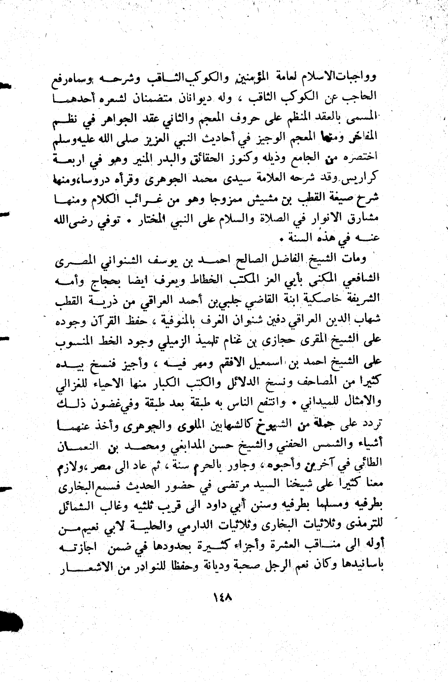 ومات الشيخ الفاضل الصالح أحمد بن يوسف الشنواني المصري الشافعي المكني بأبي العز المكتب الخطاط ويعرف أيضا بحجاج وأمه الشريفة خاصكية ابنة القاضي جلبي بن أحمد العراقي من ذرية القطب شهاب الدين العراقي دفين شنوان الغرف بالمنوفية حفظ القرآن وجوده على الشيخ المقرى حجازي بن غنام تلميذ الزميلي وجود الخط المنسوب على الشيخ أحمد بن إسمعيل الافقم ومهر فيه وأجيز فنسخ بيده كثيرا من المصاحف ونسخ الدلائل والكتب الكبار منها الأحياء للغزالي والأمثال للميداني وانتفع الناس به طبقة بعد طبقة وفي غضون ذلك تردد على جملة من الشيوخ كالشهابين الملوي والجوهري وأخذ عنهما أشياء والشمس الحفني والشيخ حسن المدابغي ومحمد بن النعمان الطائي في آخرين وأحبوه وجاور بالحرم سنة ثم عاد إلى مصر ولازم معنا كثيرا على شيخنا السيد مرتضى في حضور الحديث فسمع البخارى بطرفيه ومسلما بطرفيه وسنن أبي داود إلى قريب ثلثيه وغالب الشمائل للترمذي وثلاثيات البخاري وثلاثيات الدرامي والحلية لأبي نعيم من أوله إلى مناقب العشرة وأجزاء كثيرة بحدودها في ضمن إجازته باسانيدها وكان نعم الرجل صحبة وديانة وحفظا للنوادر من الاشعار