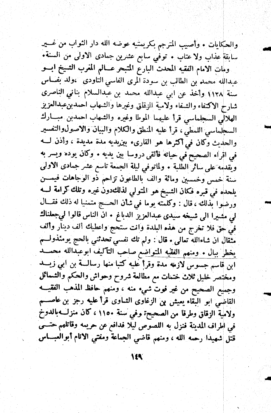 ومات الإمام الفقيه المحدث البارع المتبحر علام المغرب الشيخ أبو عبد الله محمد بن الطالب بن سودة المري الفاسي التاودي ولد بفاس سنة 1128 وأخذ عن أبي عبد الله محمد بن عبد السلام بناني الناصري شارع الأكتفاء والشفاء ولامية الزقاق وغيرها والشهاب أحمد بن عبد العزيزالهلالي السجلماسي قرأ عليهما الموطا وغيرها والشهاب أحمد بن مبارك السجلماسي اللمطي قرأ عليه المنطق والكلام والبيان والأصول والتفسير والحديث وكان في أكثرها هو القارىء بين يديه مدة مديدة وأذن له في اقراء الصحيح في حياته فألقى دروسا بين يديه وكان يوده ويسر به ويقدمه على سائر الطلبة ولما توفي ليلة الجمعة تاسع عشر جمادى الأولى سنة خمس وخمسين ومائة وألف بالطاعون تزاحم ذو الوجاهات فيمن يلحده في قبره فكان الشيخ هو المتولي لذلك دون غيره وتلك كرامة له ورضوا بذلك قال وكلمته يوما في شأن الحج متمنيا له ذلك فقال لي مشيرا إلى شيخه سيدي عبد العزيز الدباغ أن الناس قالوا لي جعلناك في حق فلا تخرج من هذه البلدة وأنت ستحج واعطيك ألف دينار وألف مثقال إن شاء الله تعالى قال: ولم تك نفسي تحدثني بالحج يومئذ ولم يخطر ببال ومنهم الفقيه المتواضع صاحب التآليف أبو عبد الله محمد ابن قاسم جسوس لازمه مدة وقرأ عليه كتبا منها رسالة بن أبي زيد ومختصر خليل ثلاث ختمات مع مطالعه شروح وحواش والحكم والشمائل وجميع الصحيح من غير فوت شيء منه ومنهم حافظ المذهب الفقيه القاضي أبو البقاء يعيش بن الزغاوي الشاوي قرأ عليه رجز بن عاصم ولامية الزقاق وطرفا من الصحيح توفي سنة 1150 كان منزله بالدوخ في أطراف المدينة فنزل به اللصوص ليلا فدافع عن حريمه وقاتلهم حتى قتل شهيدا رحمه الله ومنهم قاضي الجماعة ومفتي الأنام أبو العباس