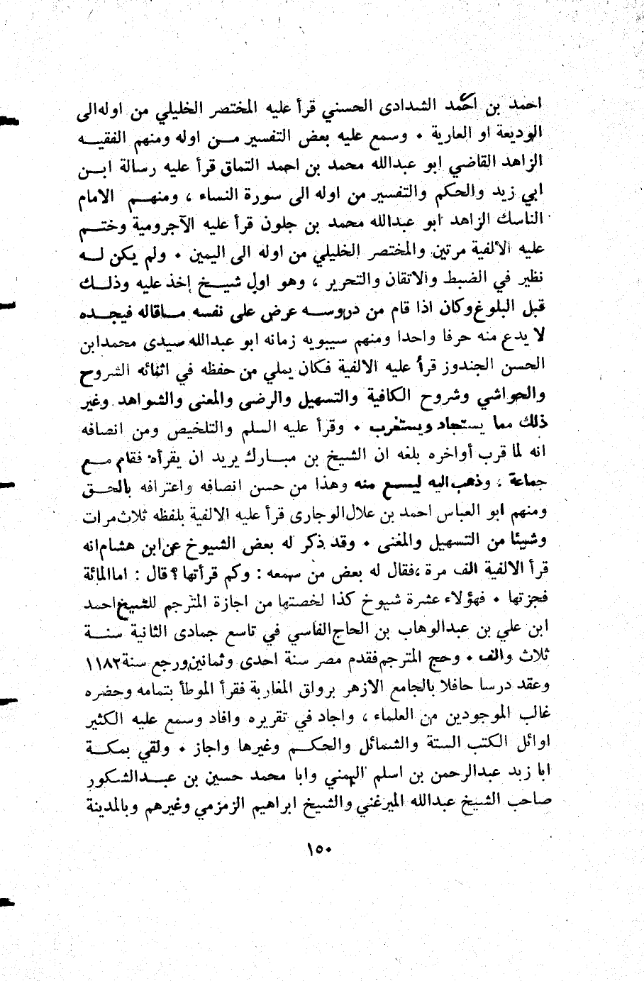 أحمد بن أحمد الشدادي الحسني قرأ عليه المختصر الخليلي من أوله إلى الوديعة أو العارية وسمع عليه بعض التفسير من أوله ومنهم الفقيه الزاهد القاضي أبو عبد الله محمد بن أحمد التماق قرأ عليه رسالة ابن أبي زيد والحكم والتفسير من أوله إلى سورة النساء ومنهم الإمام الناسك الزاهد أبو عبد الله محمد بن جلون قرأ عليه الاجرومية وختم عليه الألفية مرتين والمختصر الخليلي من أوله إلى اليمين ولم يكن له نظير في الضبط والاتقان والتحرير وهو أول شيخ أخذ عليه وذلك قبل البلوغ وكان إذا قام من دروسه عرض على نفسه ماقاله فيجده لا يدع منه حرفا واحدا ومنهم سيبويه زمانه أبو عبد الله سيدي محمد ابن الحسن الجندوز قرأ عليه الألفية فكان يملي من حفظه في اثنائه الشروح والحواشي وشروح الكافية والتسهيل والرضي والمعنى والشواهد وغير ذلك مما يستجاد ويستغرب وقرأ عليه السلم والتلخيص ومن انصافه أنه لما قرب اواخره بلغه أن الشيخ بن مبارك يريد أن يقرأه فقام مع جماعة وذهب إليه ليسمع منه وهذا من حسن انصافه واعترافه بالحق ومنهم أبو العباس أحمد بن علال الوجاري قرأ عليه الألفية بلفظة ثلاث مرات وشيئا من التسهيل والمغنى وقد ذكر له بعض الشيوخ عن ابن هشام أنه قرأ الألفية ألف مرة فقال له بعض من سمعه وكم قرأتها قال أما المائة فجزتها فهؤلاء عشرة شيوخ كذا لخصتها من إجازة المترجم للشيخ أحمد ابن علي بن عبد الوهاب بن الحاج الفاسي في تاسع جمادى الثانية سنة ثلاث وألف وحج المترجم فقدم مصر سنة أحدى وثمانين ورجع سنة 1182 وعقد درسا حافلا بالجامع الأزهر برواق المغاربة فقرأ الموطأ بتمامه وحضره غالب الموجودين من العلماء واجاد في تقريره وافاد وسمع عليه الكثير أوائل الكتب الستة والشمائل والحكم وغيرها واجاز ولقي بمكة أبا زبد عبد الرحمن بن اسلم اليمني وأبا محمد حسين بن عبد الشكور صاحب الشيخ عبد الله الميرغني والشيخ إبراهيم الزمزمي وغيرهم وبالمدينة