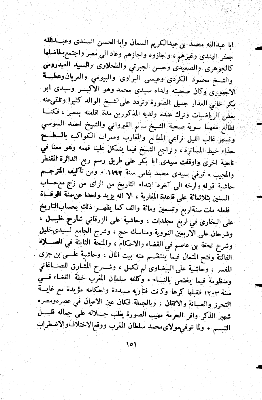 أبا عبد الله محمد بن عبد الكريم السمان وابا الحسن السندي وعبد الله جعفر الهندي وغيرهم واجازوه واجازهم وعاد إلى مصر واجتمع بفاضلها كالجوهري والصعيدي وحسن الجبرتي والطحلاوي والسيد العيدروس والشيخ محمود الكردي وعيسى البراوي والبيومي والعربان وعطية الأجهوري وكان صحبته ولداه سيدي محمد وهو الأكبر وسيدي أبو بكر خالي العذار جميل الصورة وتردد على الشيخ الوالد كثيرا وتلقى عنه بعض الرياضيات وترك عنده ولديه المذكورين مدة إقامته بمصر فكنا نطالع معهما سوية صحبة الشيخ سالم القيرواني والشيخ أحمد السوسي ونسهر غالب الليل نراعي المطالع والمغارب وممرات الكواكب بالسطح حذاء خيط المساترة ونراجع الشيخ فيما يشكل علينا فهمه وهو معنا في ناحية أخرى واوقفت سيدي أبا بكر على طريق رسم ربع الدائرة المقنطر والمجيب توفي سيدي محمد بفاس سنة 1193 ومن تآليف المترجم حاشية قوله وارخه إلى آخره ابتداء التاريخ من الزاي من زج مع حساب السنين بثلاثمائة على قاعدة المغاربة إلا أنه يزيد واحدا عن سنة الوفاة فلعله مات سنة أربع وتسعين ومائة وألف كما يظهر ذلك بحساب التاريخ على البخاري في أربع مجلدات وحاشية على الزرقاني شارح خليل وشرحان على الأربعين النووية ومناسك حج وشرح الجامع لسيدي خليل وشرح تحفة بن عاصم في القضاء والأحكام والمنحة الثابتة في الصلاة الفائتة وفتح المتعال فيما ينتظم منه بيت المال وحاشية علي بن جزي المفسر وحاشية على البيضاوي لم تكمل وشرح المشارق للصاغاني ومنظومة فيما يختص بالنساء وكلفه سلطان المغرب خطة القضاء في سنة 1203 فقبلها كرها وكانت فتاويه مسددة واحكامه مؤيدة مع غاية التحرز والصيانة والاتقان وبالجملة فكان عين الأعيان في عصره ومصره شهير الذكر وافر الحرمة مهيب الصورة يغلب دلاله على جماله قليل التبسم ولما توفي مولاي محمد سلطان المغرب ووقع الاختلاف والاضطراب