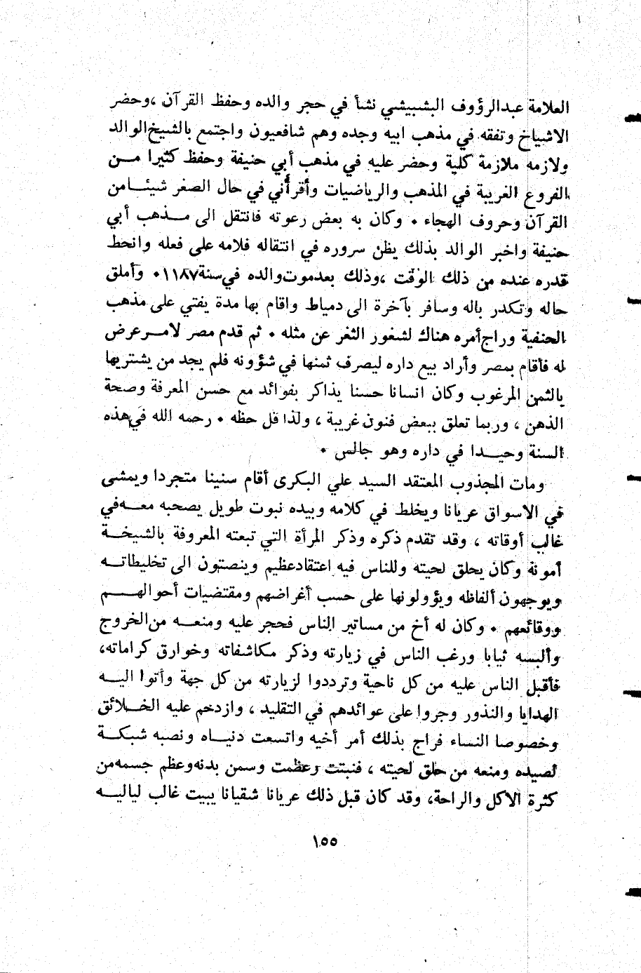 العلامة عبد الرؤوف البشبيشي نشأ في حجر والده وحفظ القرآن وحضر الاشياخ وتفقه في مذهب ابيه وجده وهم شافعيون واجتمع بالشيخ الوالد ولازمه ملازمة كلية وحضر عليه في مذهب أبي حنيفة وحفظ كثيرا من الفروع الغريبة في المذهب والرياضيات وأقراني في حال الصغر شيئا من القرآن وحروف الهجاء وكان به بعض رعوته فانتقل إلى مذهب أبي حنيفة واخبر الوالد بذلك يظن سروره في انتقاله فلامه على فعله وانحط قدره عنده من ذلك الوقت وذلك بعد موت والده في سنة 1187 واملق حاله وتكدر باله وسافر بآخرة إلى دمياط وأقام بها مدة يفتي على مذهب الحنفية وراج أمره هناك لشغور الثغر عن مثله ثم قدم مصر لامر عرض له فأقام بمصر وأراد بيع داره ليصرف ثمنها في شؤونه فلم يجد من يشتريها بالثمن المرغوب وكان إنسانا حسنا يذاكر بفوائد مع حسن المعرفة وصحة الذهن وربما تعلق ببعض فنون غريبة ولذا قل حظه رحمه الله في هذه السنة وحيدا في داره وهو جالس.