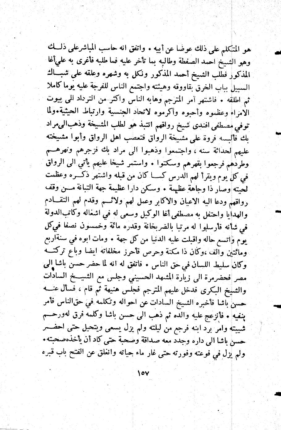 هو المتكلم على ذلك عوضا عن أبيه واتفق أنه حاسب المباشر على ذلك وهو الشيخ أحمد الصفطة وطالبه بما تأخر عليه فما طلبه فأغرى به علي أغا المذكور فطلب الشيخ أحمد المذكور ونكل به وشهره وعلقه على شباك السبيل بباب الخرق بقاووقه وهيئته واجتمع الناس للفرجة عليه يوما كاملا ثم اطلقه فاشتهر أمر المترجم وهابه الناس وأكثر من الترداد إلى بيوت الأمراء وعظموه وأحبوه وأكرموه لاتحاد الجنسية وارتباط الحيثية ولما توفي مصطفى أفندي شيخ رواقهم انتبذ هو لطلب المشيخة وذهب إلى مراد بك فألبسه فروة على مشيخة الرواق فتعصب أهل الرواق وأبو مشيخته عليهم لحداثة سنه واجتعوا وذهبوا إلى مراد بك فزجرهم ونهرهم وطردهم فرجعوا بقهرهم وسكتوا واستمر شيخا عليهم يأتي إلى الرواق في كل يوم ويقرأ لهم الدرس كما كان من قبله واشتهر ذكره وعظمت لحيته وصار ذا وجاهة عظيمة وسكن دارا عظيمة جهة التبانة من وقف رواقهم ودعا إليه الأعيان والأكابر وعمل لهم ولائم وقدم لهم التقادم والهدايا واحتفل به مصطفى أغا الوكيل وسعى له في اشغاله وكاتب الدولة في شأنه فأرسلوا له مرتبا بالضربخانة وقدره مائة وخمسون نصفا في كل يوم واتسع حاله وأقبلت عليه الدنيا من كل جهة ومات أبوه في سنة أربع ومائتين وألف وكان ذا مكنة وحرص فأحرز مخلفاته أيضا وباع تركته وكان سليط اللسان في حق الناس فاتفق أنه لما حضر حسن باشا إلى مصر فحضر مرة إلى زيارة المشهد الحسيني وجلس مع الشيخ السادات والشيخ البكري فدخل عليهم المترجم فجلس هنيهة ثم قام فسأل عنه حسن باشا فأخبره الشيخ السادات عن أحواله وتكلمه في حق الناس فأمر بنفيه فأنزعج عليه والده ثم ذهب إلى حسن باشا وكلمه فرق له ورحم شيبته وأمر برد ابنه فرجع من ليلته ولم يزل يسعى ويتحيل حتى أحضر حسن باشا إلى داره وجدد معه صداقة وصحبة حتى كان أن يأخذه صحبته ولم يزل في فوعته وفورته حتى غار ماء حياته وانغلق عن الفتح باب قبره