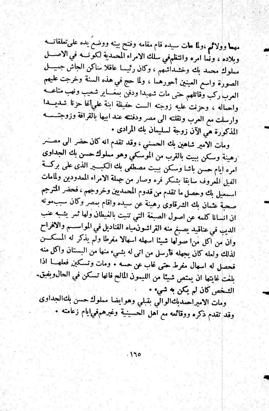 مهما وولائم ولما مات سيده قام مقامه وفتح بيته ووضع يده على تعلقاته وبلاده ونما أمره وانتظم في سلك الأمراء المحمدية لكونه في الأصل مملوك محمد بك وخشداشهم وكان رئيسا عاقلا ساكن الجاش جميل الصورة واسع العينين أحورهما ولما حج في هذه السنة وخرجت عليهم العرب ركب وقاتلهم حتى مات شهيدا ودفن بمغاير شعيب ونهب متاعه واحماله وحزنت عليه زوجته الست حفيظة ابنة علي أغا حزنا شديدا وأرسلت مع العرب ونقلته إلى مصر ودفنته عند ابيها بالقرافة وزوجته المذكورة هي الآن زوجة لسليمان بك المرادي.