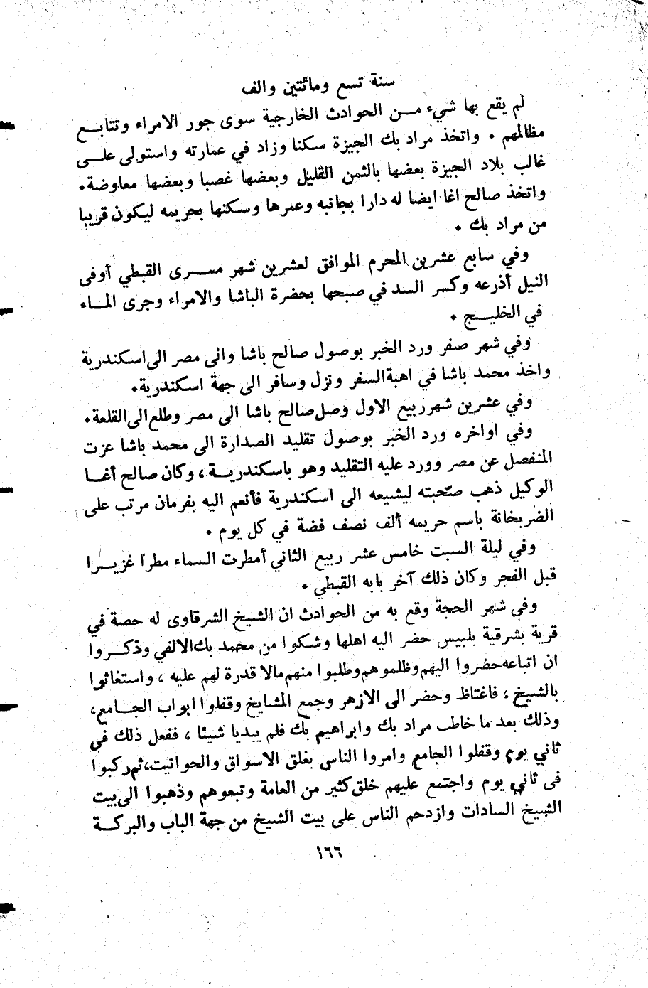 لم يقع بها شيء من الحوادث الخارجية سوى جور الأمراء وتتابع مظالمهم واتخد مراد بك الجيزة سكنا وزاد في عمارته واستولى على غالب بلاد الجيزة بعضها بالثمن القليل وبعضها غصبا وبعضها معاوضه واتخذ صالح اغا أيضا له دار بجانبه وعمرها وسكنها بحريمه ليكون قريبا من مراد بك.
