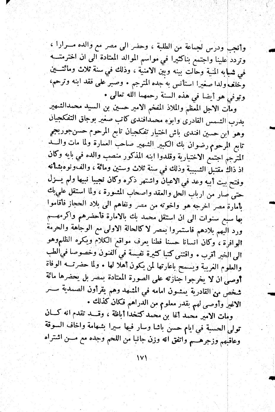 ومات الأجل المعظم والملاذ المفخم الأمير حسين بن السيد محمد الشهير بدرب الشمس القادري وابوه محمد أفندي كاتب صغير بوجاق التفكجيان وهو ابن حسين أفندي باش اختيار تفكجيان تابع المرحوم حسن جوربجي تابع المرحوم رضوان بك الكبير الشهير صاحب العمارة ولما مات والد المتجرم اجتمع الاختيارية وقلدوا ابنه المذكور منصب والده في بابه وكان إذ ذاك مقتبل الشبيبة وذلك في سنة ثلاث وستين ومائة وألف ونوه بشأنه وفتح بيت أبيه وعد في الأعيان واشتهر ذكره وكان نجيبا نبيها ولم يزل حتى صار من أرباب الحل والعقد واصحاب المشورة ولما استقل علي بك بأمارة مصر اخرجه هو واخوته من مصر ونفاهم إلى بلاد الحجاز فأقاموا بها سبع سنوات إلى أن استقل محمد بك بالامارة فأحضرهم وأكرمهم ورد إليهم بلادهم فاستمروا بمصر لا كالحالة الأولى مع الوجاهة والحرمة الوافرة وكان إنسانا حسنا فطنا يعرف مواقع الكلام ويكره الظلم وهو إلى الخير أقرب واقتنى كتبا كثيرة نفيسة في الفنون وخصوصا في الطب والعلوم الغريبة ويسمح باعارتها لمن يكون أهلا لها ولما حضرته الوفاة أوصى أن لا يخرجوا جنازته على الصورة المعتادة بمصر بل يحضرها مائة شخص من القادرية يمشون إمامه في المشهد وهم يقرأون الصمدية سر الاغير وأوصى لهم بقدر معلوم من الدراهم فكان كذلك.