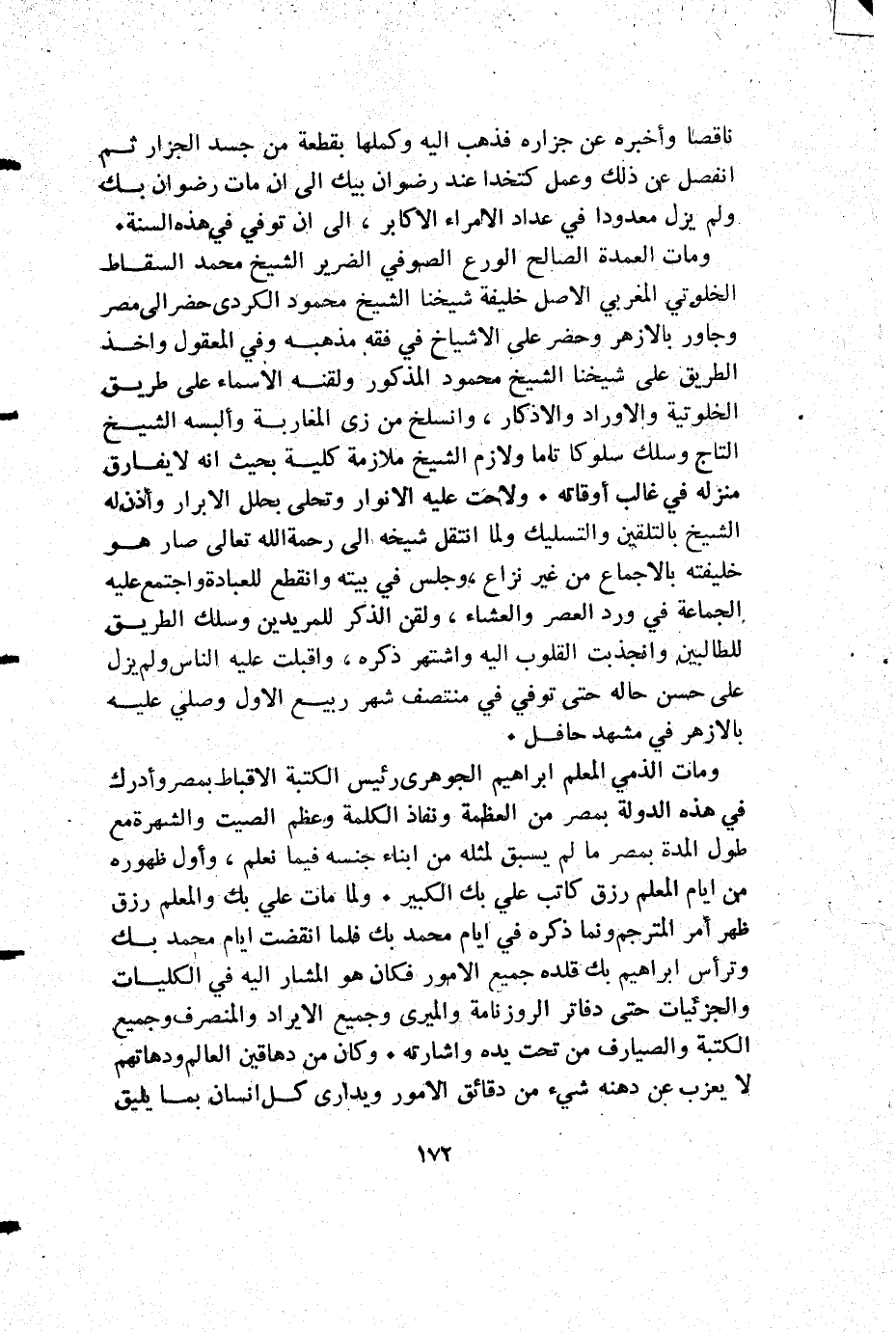 ناقصا وأخبره عن جزاره فذهب إليه وكملها بقطعة من جسد الجزار ثم انفصل عن ذلك وعمل كتخدا عند رضوان بيك إلى أن مات رضوان بك ولم يزل معدودا في عداد الأمراء الأكابر إلى أن توفي في هذه السنة.