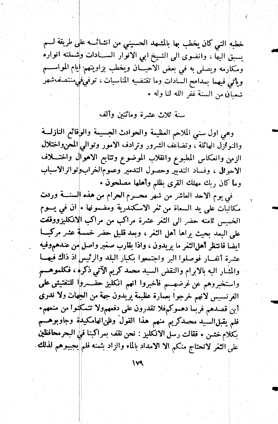 في يوم الأحد العاشر من شهر محرم الحرام من هذه السنة وردت مكاتبات على يد السعاة من ثغر الأسكندرية ومضمونها أن في يوم الخميس ثامنه حضر إلى الثغر عشرة مراكب من مراكب الانكليز ووقفت على البعد بحيث يراها أهل الثغر وبعد قليل حضر خمسة عشر مركبا أيضا فانتظر أهل الثغر ما يريدون وإذا بقارب صغير وأصل من عندهم وفيه عشرة انفار فوصلوا البر واجتمعوا بكبار البلد والرئيس إذ ذاك فيها والمشار إليه بالإبرام والنقض السيد محمد كريم الآتي ذكره فكلموهم واستخبروهم عن غرضهم فأخبروا أنهم انكليز حضروا للتفتيش على الفرنسيس لانهم خرجوا بعمارة عظيمة يريدون جهة من الجهات ولا ندري أين قصدهم فربما دهموكم فلا تقدرون علىدفعهم ولا تتمكنوا من منعهم فلم يقبل السيد محمد كريم منهم هذا القول وظن أنها مكيدة وجاوبوهم بكلام خشن فقالت رسل الانكليز نحن نقف بمراكبنا في البحر محافظين على الثغر لا نحتاج منكم إلا الأمداد بالماء والزاد بثمنه فلم يجيبوهم لذلك