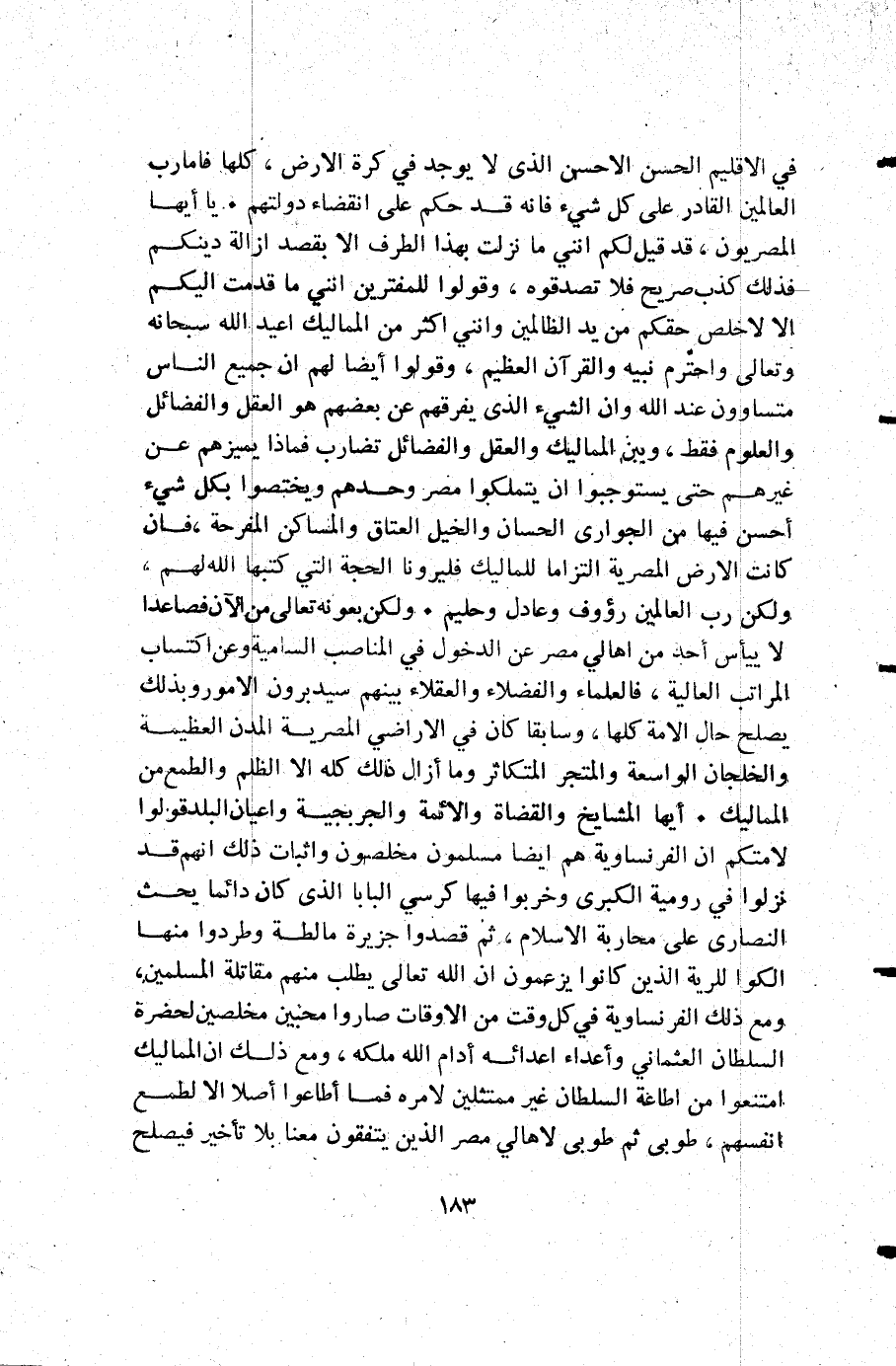 في الإقليم الحسن الأحسن الذي لا يوجد في كرة الأرض كلها فأما رب العالمين القادر على كل شيء فإنه قد حكم على انقضاء دولتهم يا أيها المصريون قد قيل لكم: إنني ما نزلت بهذا الطرق إلا بقصد إزالة دينكم فذلك كذب صريح فلا تصدقوه وقولوا للمفترين إنني ما قدمت إليكم إلا لأخلص حقكم من يد الظالمين وإنني أكثر من المماليك أعبد الله سبحانه وتعالى واحترم نبيه والقرآن العظيم وقولوا أيضا لهم: إن جميع الناس متساوون عند الله وأن الشيء الذي يفرقهم عن بعضهم هو العقل والفضائل والعلوم فقط وبين المماليك والعقل والفضائل تضارب فماذا يميزهم عن غيرهم حتى يستوجبوا أن يتملكوا مصر وحدهم ويختصوا بكل شيء أحسن فيها من الجواري الحسان والخيل العتاق والمساكن المفرحة فإن كانت الأرض المصرية التزاما للماليك فليرونا الحجة التي كتبها الله لهم ولكن رب العالمين رؤوف وعادل وحليم ولكن بعونه تعالى من الآن فصاعدا لا ييأس أجد من أهالي مصر عن الدخول في المناصب الساميةوعن اكتساب المراتب العالية فالعلماء والفضلاء والعقلاء بينهم سيدبرون الأمور وبذلك يصلح حال الأمة كلها وسابقا كان في الاراضي المصرية المدن العظيمة والخلجان الواسعة والمتجر المتكاثر وما إزال ذلك كله إلا الظلم والطمع من المماليك أيها المشايخ والقضاة والأئمة والجربجية وأعيان البلد قولوا: لأمتكم أن الفرنساوية هم أيضا مسلمون مخلصون وإثبات ذلك أنهم قد نزلوا في رومية الكبرى وخربوا فيها كرسي الباب الذي كان دائما يحث النصارى على محاربة الإسلام ثم قصدوا جزيرة مالطة وطرودا منها الكوا للرية الذين كانوا يزعمون أن الله تعالى يطلب منهم مقاتلة المسلمين ومع ذلك الفرنساوية في كل وقت من الأوقات صاروا محبين مخلصين لحضرة السلطان العثماني وأعداء أعدائه أدام الله ملكه ومع ذلك أن المماليك امتنعوا من إطاعة السلطان غير ممتثلين لامره فما أطاعوا أصلا إلا لطمع أنفسهم طوبى ثم طوبى لأهالي مصر الذين يتفقون معنا بلا تأخير فيصلح