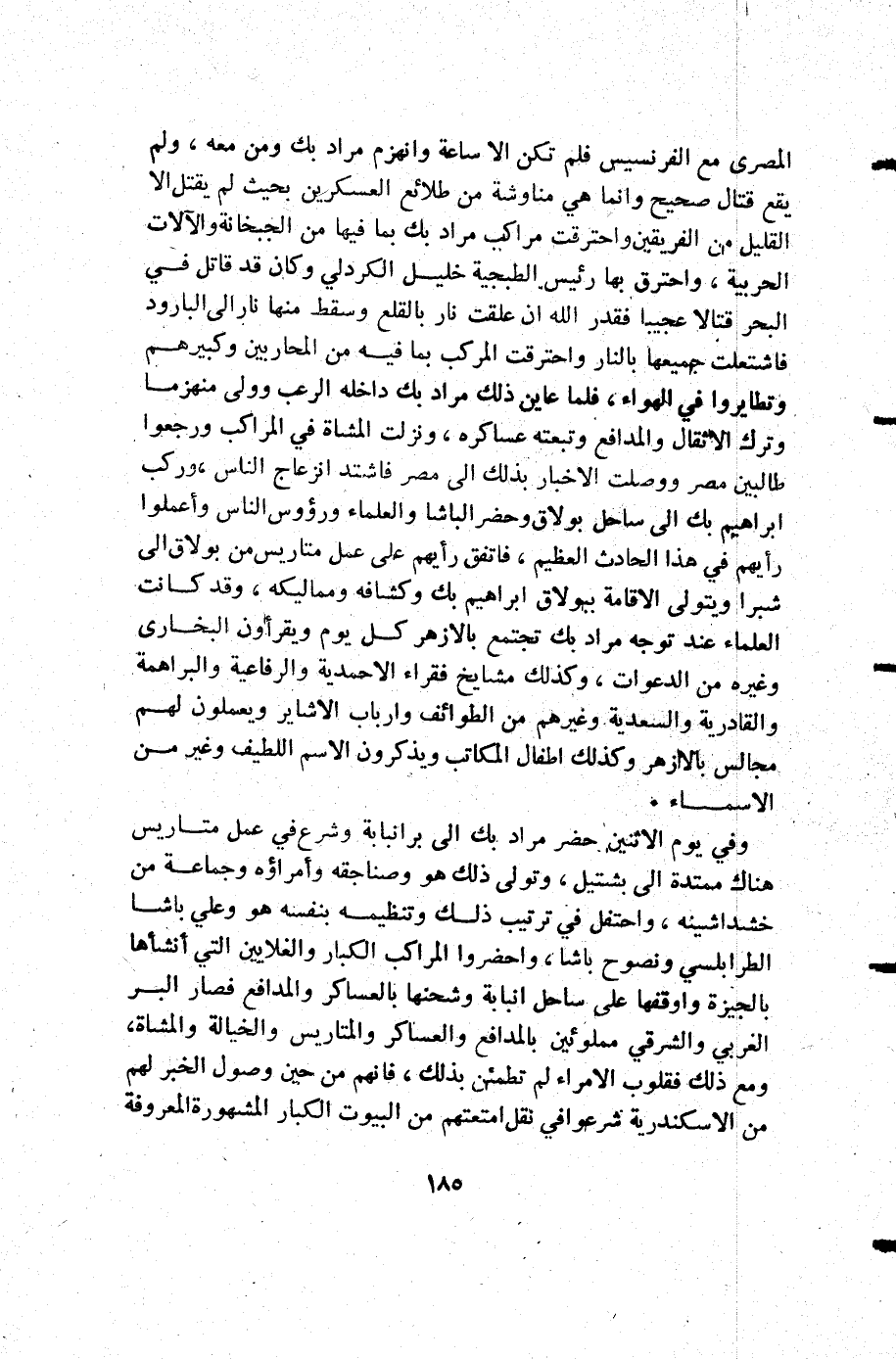 المصري مع الفرنسيس فلم تكن إلا ساعة وأنهزم مراد بك ومن معه ولم يقع قتال صحيح وإنما هي مناوشة من طلائع العسكرين بحيث لم يقتل إلا القليل من الفريقين واحترقت مراكب مراد بك بما فيها من الجبخانة والآلات الحربية واحترق بها رئيس الطبجية خليل الكردل وكان قد قاتل في البحر قتالا عجيبا فقدر الله أن علقت نار بالقلع وسقط منها نار إلى البارود فاشتعلت جميعها بالنار واحترقت المركب بما فيه من المحاربين وكبيرهم وتطايروا في الهواء فلما عاين ذلك مراد بك داخله الرعب وولى منهزم وترك الاثقال والمدافع وتبعته عساكره ونزلت المشاة في المراكب ورجعوا طالبين مصر ووصلت الأخبار بذلك إلى مصر فاشتد انزعاج الناس وركب إبراهيم بك إلى ساحل بولاق وحضر الباشا والعلماء ورؤوس الناس وأعملوا رأيهم في هذا الحادث العظيم فاتفق رأيهم على عمل متاريس من بولاق إلى شبرا ويتولى الإقامة ببولاق إبراهيم بك وكشافه ومماليكه وقد كانت العلماء عند توجه مراد بك تجتمع بالأزهر كل يوم ويقرأو البخارى وغيره من الدعوات وكذلك مشايخ فقراء الأحمدية والرفاعية والبراهمة والقادرية والسعدية وغيرهم من الطوائف وأرباب الإشاير ويعملون لهم مجالس بالأزهر وكذلك أطفال المكاتب ويذكرون الأسم اللطيف وغير من الأسماء.
