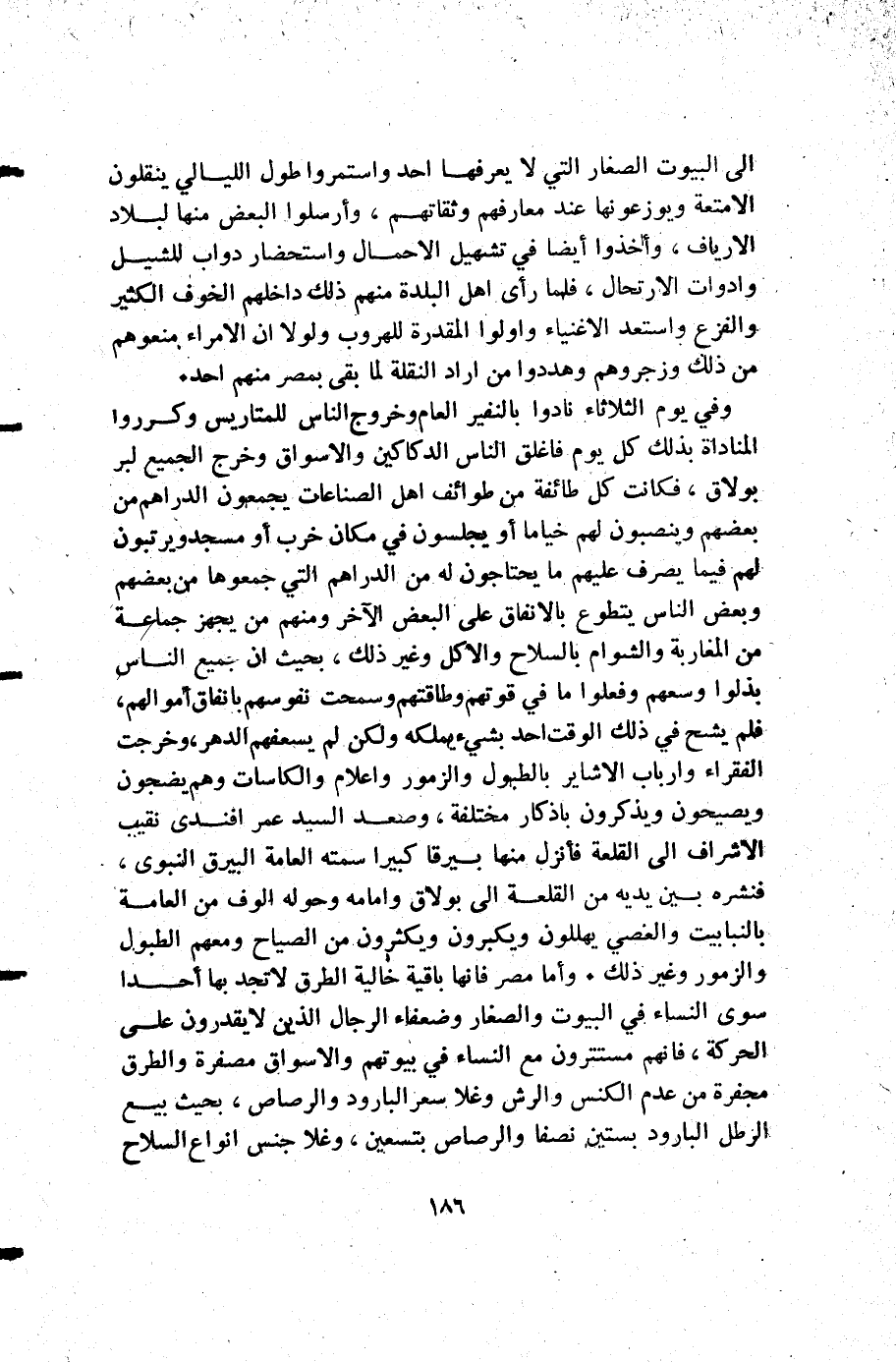 وفي يوم الثلاثاء نادوا بالنفير العام وخروج الناس للمتاريس وكرروا المناداة بذلك كل يوم فاغلق الناس الدكاكين والأسواق وخرج الجميع لبر بولاق قكانت كل طائفة من طوائف أهل الصناعات يجمعون الدراهم من بعضهم وينصبون لهم خياما أو يجلسون في مكان خرب أو مسجد ويرتبون لهم فيما يصرف عليهم ما يحتاجون له من الدراهم التي جمعوها من بعضهم وبعض الناس يتطوع بالانفاق على البعض الآخر ومنهم من يجهز جماعة من المغاربة والشوام بالسلاح والاكل وغير ذلك بحيث أن جميع الناس بذلوا وسعهم وفعلوا ما في قوتهم وطاقتهم وسمحت نفوسهم بانفاق أموالهم فلم يشح في ذلك الوقت أجد بشيء يملكه ولكن لم يسعفهم الدهر وخرجت الفقراء وأرباب الإشاير بالطبول والزمور وأعلام والكاسات وهم يضجون ويصيحون ويذكرن باذكار مختلفة وصعد السيد عمر أفندي نقيب الأشراف إلى القلعة فأنزل منها بيرقا كبيرا سمته العامة البيرق النبوي فنشره بين يديه من القلعة إلى بولاق وإمامه وحوله الوف من العامة بالنبابيت والعصي يهللون ويكبرون ويكثرون من الصياح ومعهم الطبول والزمور وغير ذلك وأما مصر فإنها باقية خالية الطرق لا تجد بها أحدا سوى النساء في البيوت والصغار وضعفاء الرجال الذين لا يقدرون على الحركة فإنهم مستترون مع النساء في بيوتهم والأسواق مصفرة والطرق مجفرة من عدم الكنس والرش وغلا سعر البارود والرصاص بحيث بيع الرطل البارود بستين نصفا والرصاص بتسعين وغلا جنس أنواع السلاح
