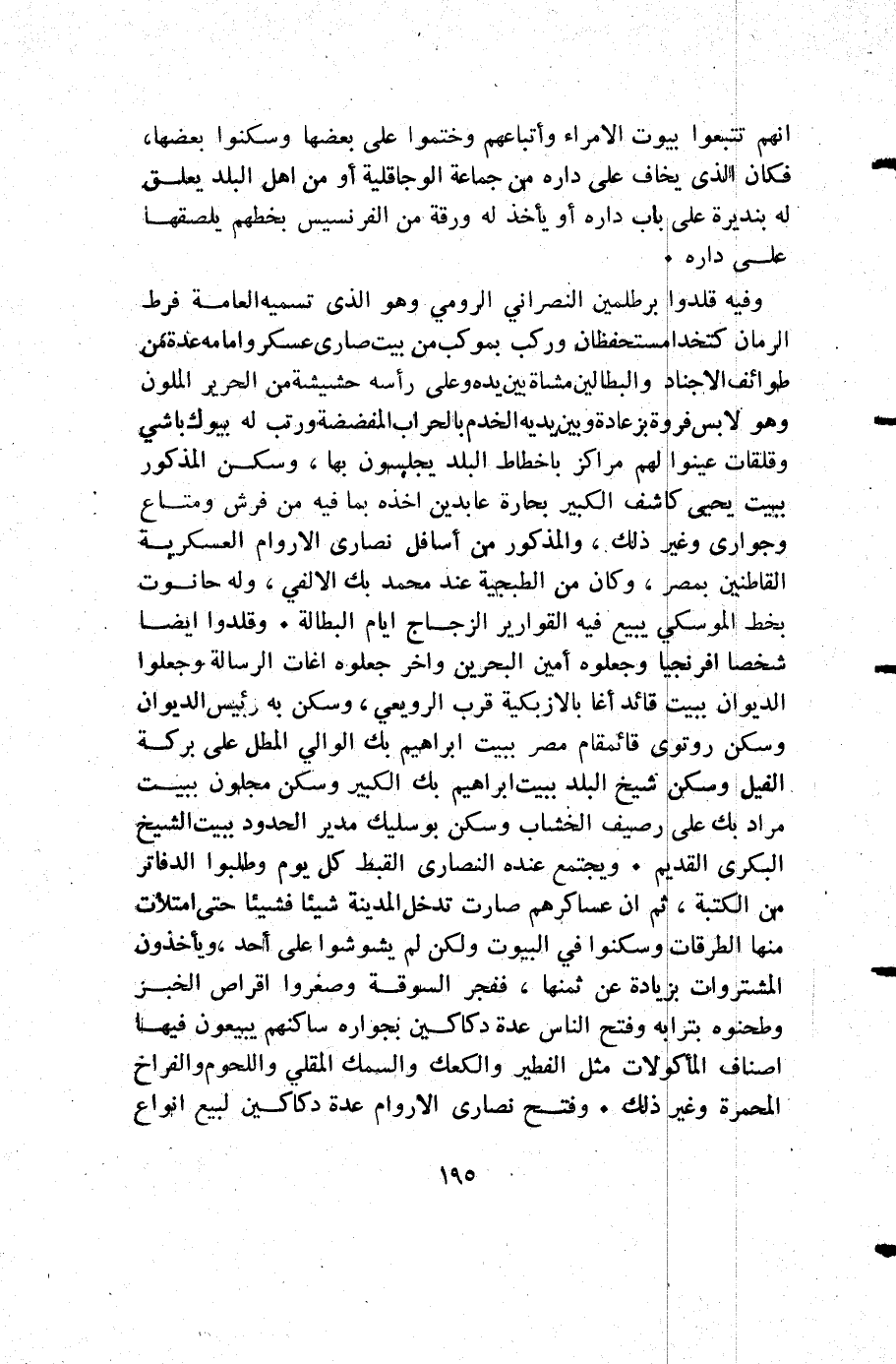 أنهم تتبعوا بيوت الأمراء وأتباعهم وختموا على بعضها وسكنوا بعضها فكان الذي يخاف على داره من جماعة الوجاقلية أو من أهل البلد يعلق له بنديرة على باب داره أو يأخذ له ورقة من الفرنسيس بخطهم يلصقها على داره.