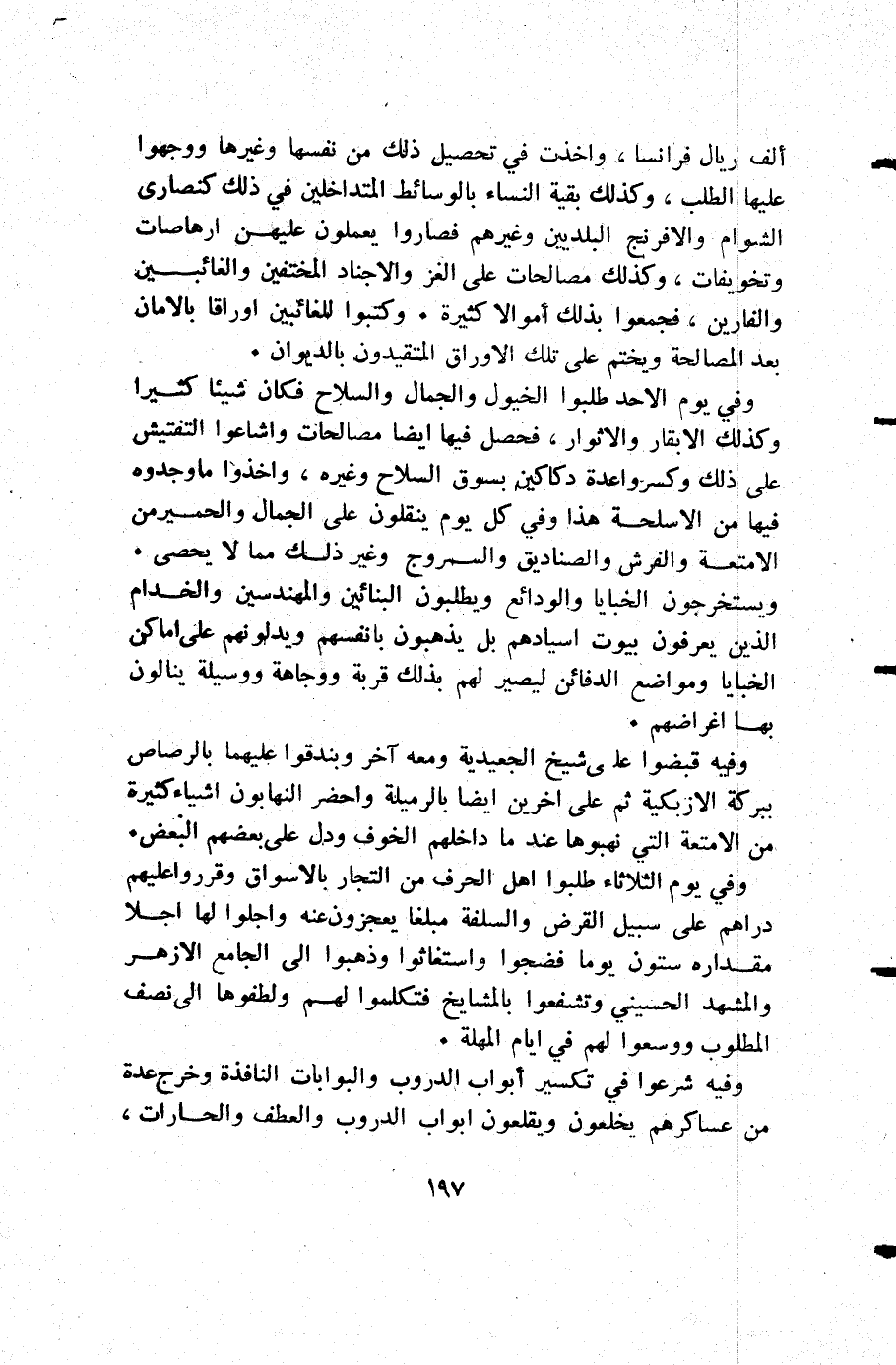 ألف ريال فرانسا وأخذت في تحصيل ذلك من نفسها وغيره ووجهوا عليها الطلب وكذلك بقية النساء بالوسائط المتداخلين في ذلك كنصارى الشوام والافرنج البلدين وغيرهم فصاروا يعملون عليهن ارصاهات وتخويفات وكذلك مصالحات على الغز والأجناد المختفين والغائبين والفارين فجمعوا بذلك أموالا كثيرة وكتبوا للغائبين اوراقا بالأمان بعد المصالحه ويختم على تلك الأوراق المتقيدون بالديوان.