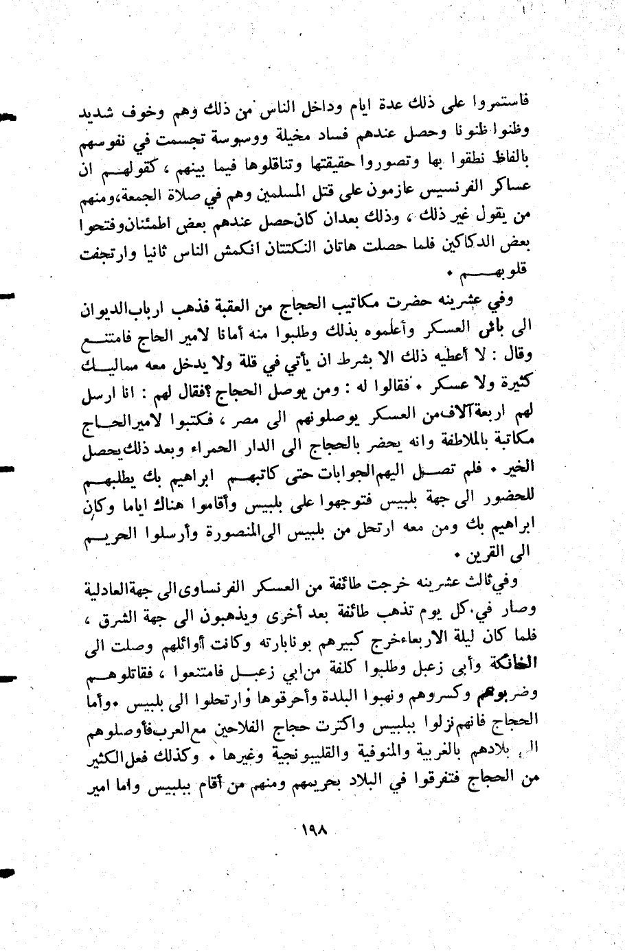 وفي عشرينه حضرت مكاتب الحجاج من العقبة فذهب أرباب الديوان إلى باش العسكر وأعلموه بذلك وطلبوا منه أمانا لأمير الحاج فامتنع وقال: لا أعطيه ذلك إلا بشرط أن يأتي في قلة ولا يدخل معه مماليك كثيرة ولا عسكر فقالوا له: ومن يوصل الحجاج فقال لهم أنا أرسل لهم أربعة آلاف من العسكر يوصولونهم إلى مصر فكتبوا لأمير الحاج مكاتبة بالملاطفة وأنه يحضر بالحجاج إلى الدار الحمراء وبعد ذلك يحصل الخير فلم تصل إليهم الجوابات حتى كاتبهم إبراهيم بك يطلبهم للحضور إلى جهة بلبيس فتوجهوا على بلبيس وأقاموا هناك أياما وكان إبراهيم بك ومن معه ارتحل من بلبيس إلى المنصورة وأرسلوا الحريم إلى القرين.