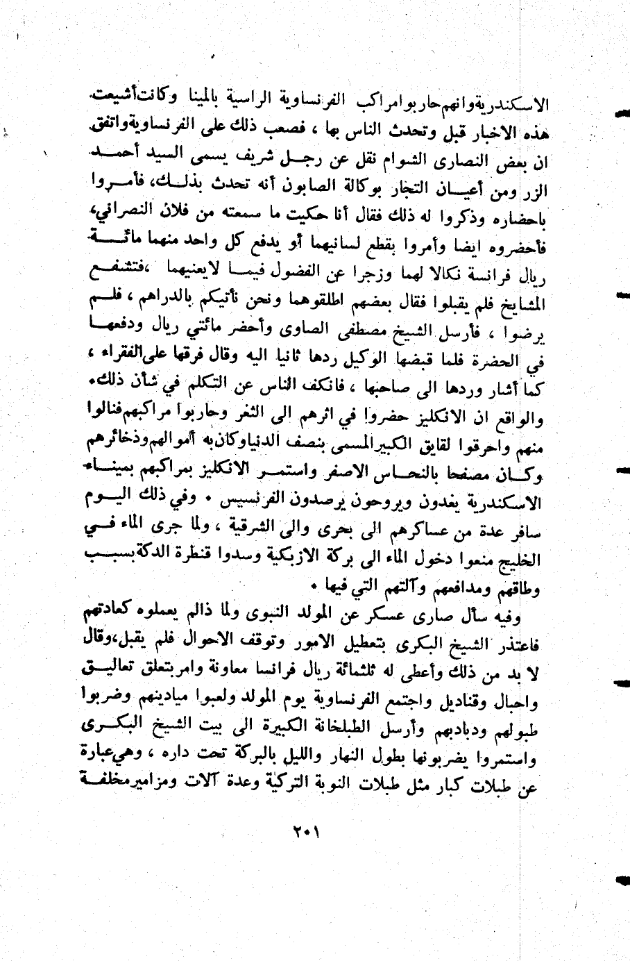الاسكندرية وأنهم حاربوا مراكب الفرنساوية الراسية بالمينا وكانت أشيعت هذه الأخبار قبل وتحدث الناس بها فصعب ذلك على الفرنساوية واتفق أن بعض النصارى الشوام نقل عن رجل شريف يسمى السيد أحمد الزر ومن أعيان التجار بوكالة الصابون أنه تحدث بذلك فأمروا باحضاره وذكروا له ذلك فقال: أنا حكيت ما سمعته من فلان النصراني فأحضروه أيضا وأمروا بقطع لسانيهما أو يدفع كل واحد منهما مائة ريال فرانسة نكالا لهما وزجرا عن الفضول فيما لا يعنيهما فتشفغ المشايخ فلم يقبلوا فقال بعضهم: أطلقوهما ونحن نأتيكم بالدراهم فلم يرضوا فأرسل الشيخ مصطفى الصاوي وأحضر مائتي ريال ودفعها في الحضرة فلما قبضها الوكيل ردها ثانيا إليه وقال: فرقها على الفقراء كما أشار وردها إلى صاحبها فانكف الناس عن التكلم في شأن ذلك والواقع أن الانكليز حضروا في أثرهم إلى الثغر وحاربوا مراكبهم فنالوا منهم واحرقوا لقايق الكبير المسمى بنصف الدنيا وكان به أموالهم وذخائرهم وكان مصفحا بالنحاس الأصفر واستمر الانكليز بمراكبهم بميناء الأسكندرية يغدون ويروحون يرصدون الفرنسيس وفي ذلك اليوم سافر عدة من عساكرهم إلى بحري وإلى الشرقية ولما جرى الماء في الخليج منعوا دخول الماء إلى بركة الأزبكية وسدوا قنطرة الدكة بسبب وطاقهم ومدافعهم وآلتهم التي فيها.