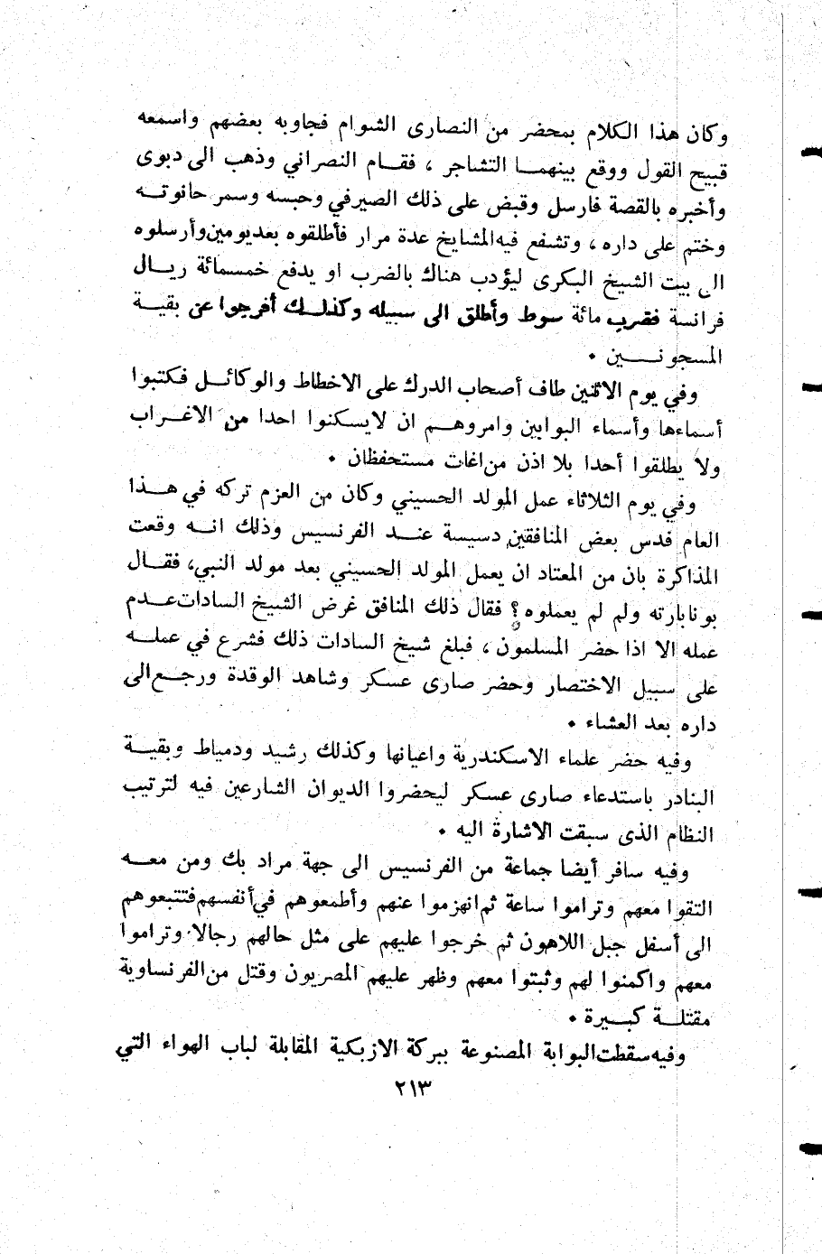 وفيه حضر علماء الأسكندرية وأعيانها وكذلك رشيد ودمياط وبقية البنادر باستدعاء صارى عسكر ليحضروا الديوان الشارعين فيه لترتيب النظام الذي سبقت الإشارة اليه.