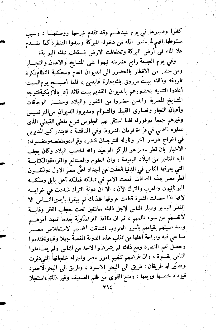 وفي يوم الجمعة رابع عشرينه نبهوا على المشايخ والأعيان التجار ومن حضر من الاقطار بالحضور إلى الديوان العام ومحكمة النظام بكرة تاريخه وذلك ببيت مرزوق بك بحارة عابدين فلما أصبح يوم السبت أعادوا التنبيه بحضورهم بالديوان القديم ببيت قائد أغا بالازبكية فتوجه المشايخ المصرية والذين حضروا من الثغور والبلاد وحضر الوجاقات وأعيان التجار ونصارى القبط والشوام ومديروا الديوان من الفرنسيس وغيرهم جمعا موفورا فلما استقر بهم الجلوس شرع ملطى القبطي الذي عملوه قاضي في قراءة فرمان الشروط وفي المناقشة فابتدر كبير المدبرين في اخراج طومار آخر وناوله للترجمان فنشره وقرأه وملخصه ومضمونه الأخبار بأن قطر مصر هو المركز الوحيد وأنه اخصب البلاد وكان يجلب إليه المتاجر من البلاد البعيدة وأن العلوم والصنائع والقراءة والكتابة التي يعرفها الناس في الدنيا أخذت عن أجداد أهل مصر الأول ولكون قطر مصر بهذه الصفات طمعت الأمم في تملكه فملكه أهل بابل وملكه اليونانيون والعرب والترك الآن إلا أن دولة الترك شددت في خرابه لأنها إذا حصلت الثمرة قطعت عروقها فلذلك لم يبقوا بأيدي الناس إلا القدر اليسير وصار الناس لأجل ذلك مختفين تحت حجاب الفقر وقاية لأنفسهم من سوء ظلمهم ثم أن طائفة الفرنساوية بعدما تمهد أمرهم وبعد صيتهم بقيامهم بأمور الحروب اشتاقت أنفسهم لاستخلاص مصر مما هي فيه واراحة أهلها من تغلب هذه الدولة المفعمة جهلا وغباوة فقدموا وحصل لهم النصرة ومع ذلك لم يتعرضوا لأحد من الناس ولم يعاملوا الناس بقسوة وأن غرضهم تنظيم أمور مصر واجراء خلجانها التي دثرت ويصير لها طريقان طريق إلى البحر الأسود وطريق إلى البحر الأحمر فيزداد خصبها وريعها ومنع القوى من ظلم الضعيف وغير ذلك استجلا