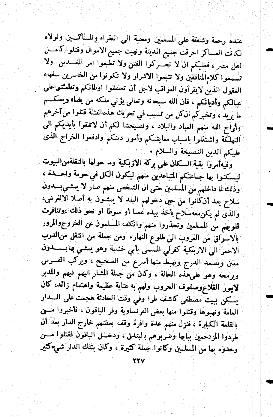 عنده رحمة وشفقة على المسلمين ومحبة إلى الفقراء والمساكين ولولاه لكانت العساكر احرقت جميع المدينة ونهبت جميع الأموال وقتلوا كامل أهل مصر فعليكم أن لا تحركوا الفتن ولا تطيعوا أمر المفسدين ولا تسمعوا كلام المنافقين ولا تتبعوا الأشرار ولا تكونوا من الخاسرين سفهاء العقول الذين لا يقرأون العواقب لأجل أن تحفظوا أوطانكم وتطمئنوا على عيالكم وأديانكم فإن الله سبحانه وتعالى يؤتى ملكه من يشاء ويحكم ما يريد وتخبركم أن كل من تسبب في تحريك هذه الفتنة قتلوا من آخرهم وأراح الله منهم العباد والبلاد ونصيحتنا لكم أن لا تلقوا بأيديكم إلى التهلكة واشتغلوا باسباب معايشكم وأمور دينكم وادفعوا الخراج الذي عليكم الدين النصيحة والسلام.