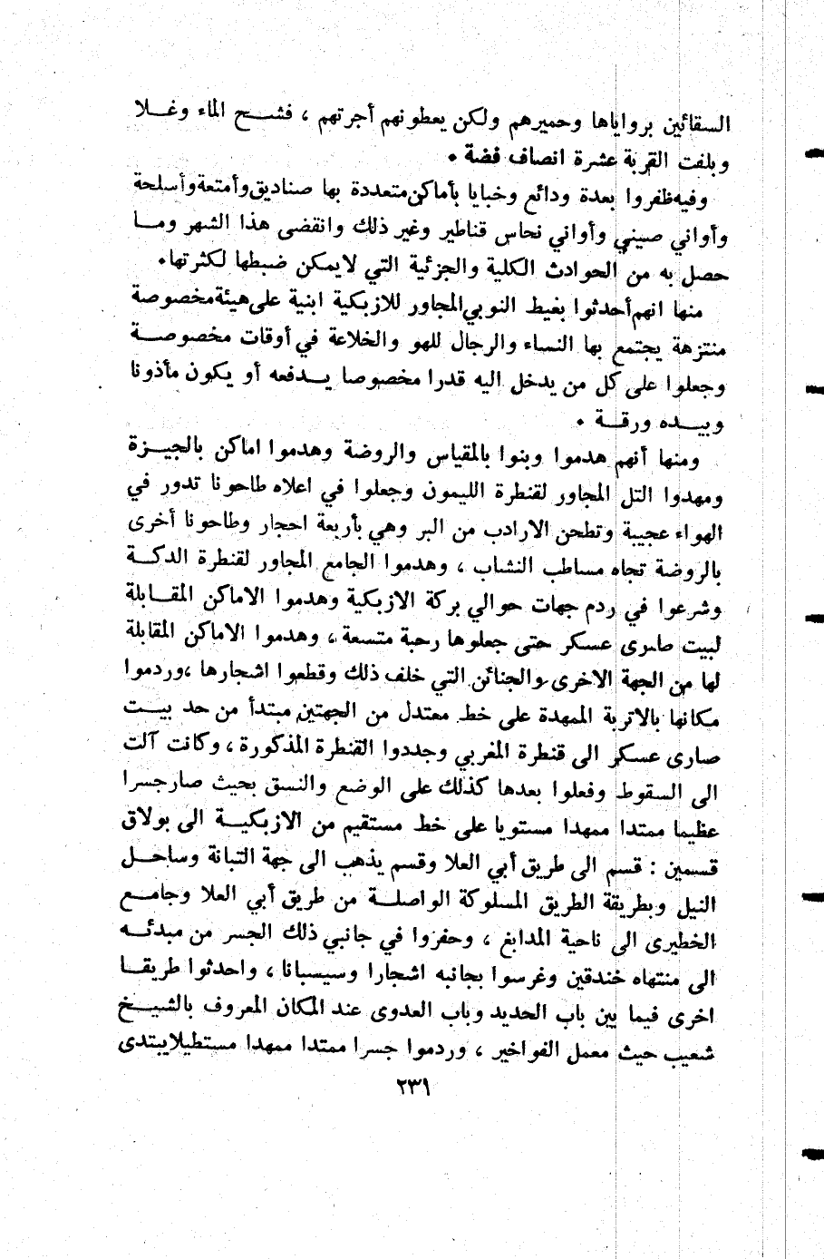 ومنها أنهم هدموا وبنوا بالمقياس والروضة وهدموا أماكن بالجيزة ومهدوا التل المجاور لقنطرة الليمون وجعلوا في أعلاه طاحونا تدور في الهواء عجيبة وتطحن الأرادب من البر وهي بأربعة أحجار وطاحونا أخرى بالروضة تجاه مساطب النشاب وهدموا الجامع المجاور لقنطرة الدكة وشرعوا في ردم جهات حوالي بركة الأزبكية وهدموا الأماكن المقابلة لبيت صارى عسكر حتى جعلوها رحبة متسعة وهدموا الأماكن المقابلة لها من الجهة الاخرى والجنائن التي خلف ذلك وقطعوا اشجارها وردموا مكانها بالأتربة الممهدة على خط معتدل من الجهتين مبتدأ من حد ببيت صارى عسكر إلى قنطرة المغربي وجددوا القنطرة المذكورة وكانت آلت إلى السقوط وفعلوا بعدها كذلك على الوضع والنسق بحيث صار جسرا عظيما ممتدا ممهدا مستويا على خط مستقم من الأزبكية إلى بولاق قسمين قسم إلى طريق أبي العلا وقسم يذهب إلى جهة التبانة وساحل النيل وبطريقة الطريق المسلوكة الواصلة من طريق أبي العلاء وجامع الخطيري إلى ناحية المدابغ وحفروا في جانبي ذلك الجسر من مبدئه إلى منتهاه خندقين وغرسوا بجانبه اشجارا وسيسبانا واحدثوا طريقا أخرى فيما بين باب الحديد وباب العدوى عند المكان المعروف بالشيخ شعيب حيث معمل الفواخير وردموا جسر ممتدا ممهدا مستطيلا يبتدي