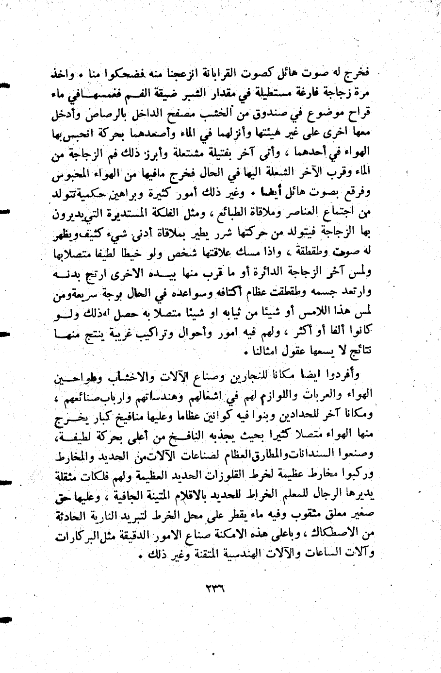 فخرج له صوت هائل كصوت القرابانة انزعجنا منه فضحكوا منا وأخذ مرة زجاجة فارغة مستطيلة في مقدار الشبر ضيقة القسم فغمسها في ماء قراح موضوع في صندوق من الخشب مصفح الداخل بالرصاص وأدخل معها أخرى على غير هيئتها وأنزلهما في الماء وأصعدهما بحركة انحبس بها الهواء في أحدهما وآتى آخر بفتيلة مشتعلة وأبرز ذلك فم الزجاجة من الماء وقرب الآخر الشعلة إليها في الحال فخرج ما فيها من الهواء المحبوس وفرقع بصوت هائل أيضا وغير ذلك أمور كثيرة وبراهين حكمية تتولد من اجتماع العناصر وملاقاة الطبائع ومثل الفلكة المستديرة التي يديرون بها الزجاج فيتولد من حركتها شرر يطير بملاقاة أدنى شيء كثيف ويظهر له صوت وطقطقة وإذا مسك علاقتها شخص ولو خيطا لطيفا متصلابها ولمس آخر الزجاجة الدائرة أو ما قرب منها بيده الأخرى ارتج بدنه وارتعد جسمه وطقطقت عظام أكتافه وسواعده في الحال برجة سريعة ومن لمس هذا اللامس أو شيئا من ثيابه أو شيئا متصلا به حصل له ذلك ولو كانوا ألفا أو أكثر ولهم فيه أمور وأ وال وتراكيب غريبة ينتج منها نتائج لا يسعها عقول أمثالنا.