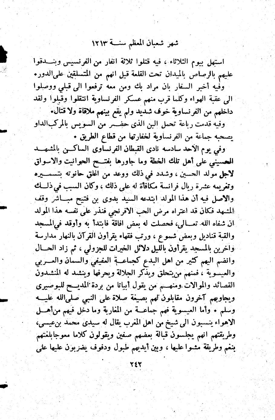 وفي يوم الأحد سادسه نادى القبطان الفرنساوي الساكن بالمشهد الحسيني على أهل تلك الخطة وما جاورها بفتح الحوانيت والأسواق لأجل مولد الحسين وشد في ذلك ووعد من اغلق حانوته بتسميره وتغريمه عشرة ريال فراسنة مكافأة له على ذلك وكان السبب في ذلك والأصل فيه أن هذا المولد ابتدعه السيد بدوي بن فتيح مباشر وقف المشهد فكان قد اعتراه مرض الحب الافرنجي فنذر على نفسه هذا المولد أن شفاه الله تعالى فحصلت له بعض إفاقة فابتدأ به وأوقد في المسجد والقبة قناديل وبعض شموع ورتب فقهاء يقرأون القرآن بالنهار مدارسة واخرين بالمسجد يقرأون بالليل دلائل الخيرات للجذولي ثم زاد الحال وانضم إليهم كثير من أهل البدع كجماعة العفيفي والسمان والعربي والعيسوية فمنهم من يتحلق ويذكر الجلالة ويحرفها وينشد له المنشدون القصائد والموالات ومنهم من يقول أبياتا من بردة المديح للبوصيري ويجاوبهم آخرون مقابلون لهم بصيغة صلاة على النبي صلى الله عليه وسلم وأما العيسوية فهم جماعة من المغاربة وما دخل فيهم من أهل الاهواء ينسبون إلى شيخ من أهل المغرب يقال له سيدي محمد بن عيسى وطريقتهم أنهم يجلسون قبالة بعضهم صفين ويقولون كلاما معوجا بلغتهم بنغم وطريقة مشوا عليها وبين أيديهم طبول ودفوف يضربون عليها على