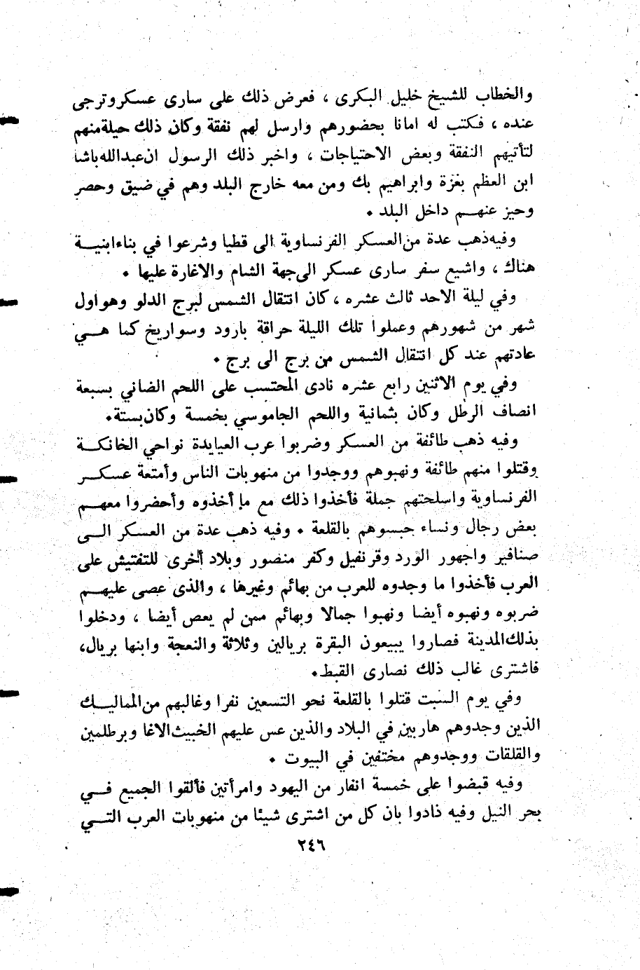 وفيه ذهب طائفة من العسكر وضربوا عرب العيايدة نواحي الخانكة وقتلوا منهم طائفة ونهبوهم ووجدوا من منهوبات الناس وأمتعة عسكر الفرنساوية واسلحتهم جملة فأخذوا ذلك مع ما أخذوه وأحضروا معهم بعض رجال ونساء حبسوهم بالقلعة وفيه ذهب عدة من العسكر إلى صنافير واجهور الورد وقرنفيل وكفر منصور وبلاد أخرى للتفتيش على العرب فأخذوا ما وجدوه للعرب من بهائم وغيرها والذي عصى عليهم ضربوه ونهبوه أيضا ونهبوا جمالا وبهائم ممن لم يعص أيضا ودخلوا بذلك المدينة فصاروا يبيعون البقرة بريالين وثلاثة والنعجة وابنها بريال فاشترى غالب ذلك نصارى القبط.