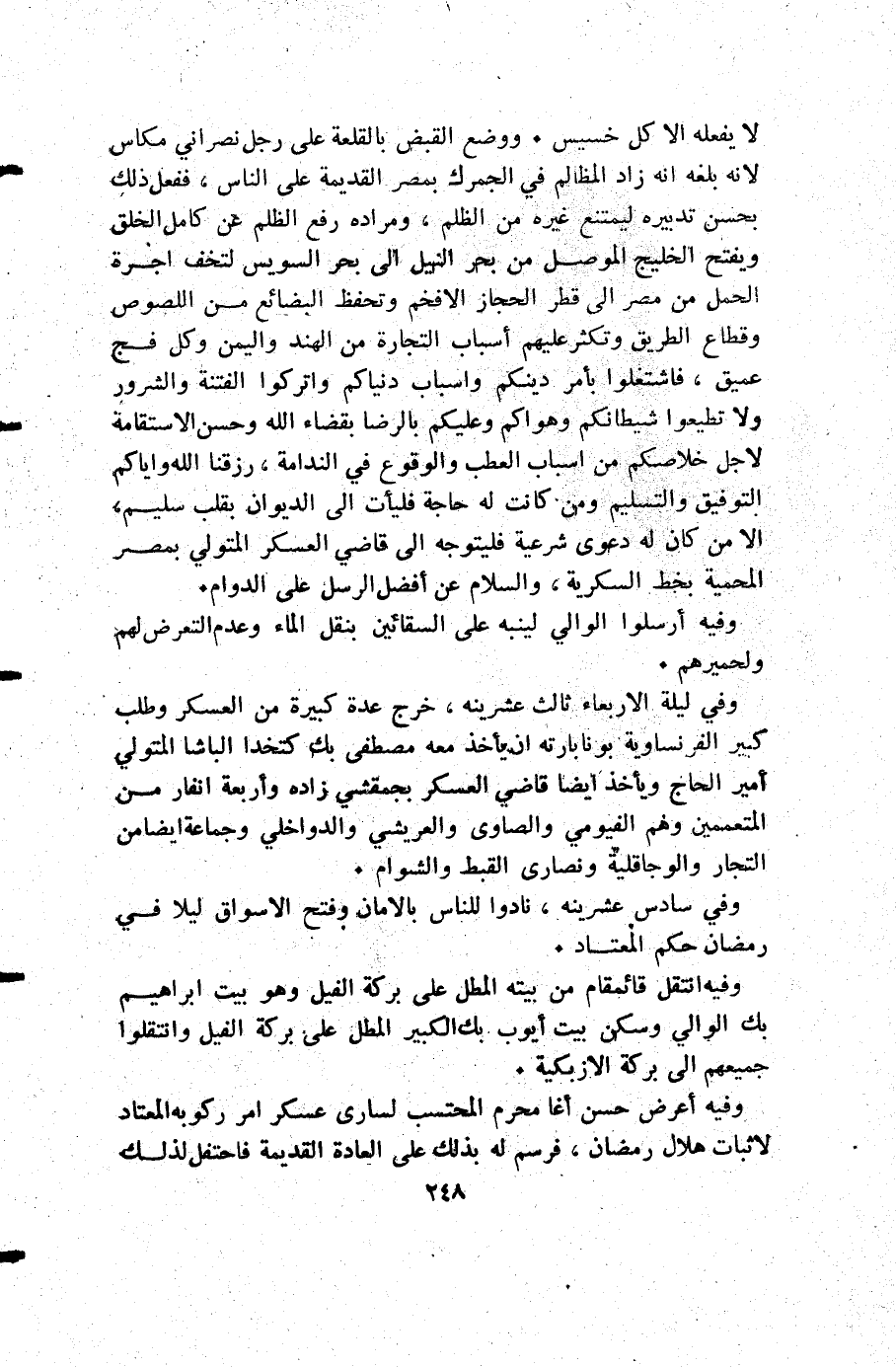 لا يفعله إلا كل خسيس ووضع القبض بالقلعة على رجل نصراني مكاس لأنه بلغه أنه زاد المظالم في الجمرك بمصر القديمة على الناس ففعل ذلك بحسن تدبيره ليمتنع غيره من الظلم ومراده رفع الظلم عن كامل الخلق ويفتح الخليج الموصل من بحر النيل إلى بحر السويس لتخف اجرة الحمل من مصر إلى قطر الحجاز الافخم وتحفظ البضائع من اللصوص وقطاع الطريق وتكثر عليهم أسباب التجارة من الهند واليمن وكل فج عميق فاشتغلوا بأمر دينكم واسباب دنياكم واتركوا الفتنة والشرور ولا تطيعوا شيطانكم وهواكم وعليكم بالرضا بقضاء الله وحسن الأستقامة لأجل خلاصكم من أسباب العطب والوقوع في الندامة رزقنا الله واياكم التوفيق والتسليم ومن كانت له حاجة فليأت إلى الديوان بقلب سليم إلا من كان له دعوى شرعية فليتوجه إلى قاضي العسكر المتولي بمصر المحمية بخط السكرية والسلام عن أفضل الرسل على الدوام.