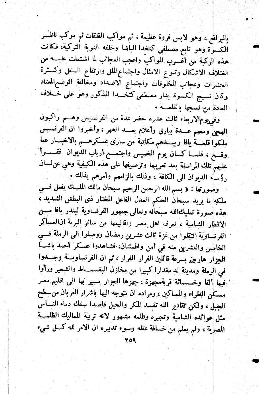 وصورتها بسم الله الرحمن الرحيم سبحان مالك الملك يفعل في ملكه ما يريد سبحان الحكم العدل الفاعل المختار ذي البطش الشديد هذه صورة تمليك الله سبحانه وتعالى جمهور الفرنساوية لبندر يافا من الاقطار الشامية نعرف أهل مصر وأقاليمها من سائر البرية أن العساكر الفرنساوية انتقلوا من غزة ثالث عشرين رمضان ووصلوا إلى الرملة في الخامس والعشرين منه في أمن واطمئنان فشاهدوا عسكر أحمد باشا الجزار هاربين بسرعة قائلين الفرار الفرار ثم أن الفرنساوية وجدوا في الرملة ومدينة لد مقدار كبير من مخازن البقسماط والشعير ورأوا فيها ألفا وخمسمائة قربة مجهزة جهزها الجزار يسير بها إلى إقليم مصر مسكن الفقراء والمساكين ومراده أن يتوجه إليها باشرار العربان من سطح الجبل ولكن تقادير الله تفسد المكر والحيل قاصدا سفك دماء الناس مثل عوائده الشامية وتجبره وظلمه مشهور لأنه تربية المماليك الظلمة المصرية ولم يعلم من خسافة عقله وسوء تدبيره أن الأمر لله كل شيء