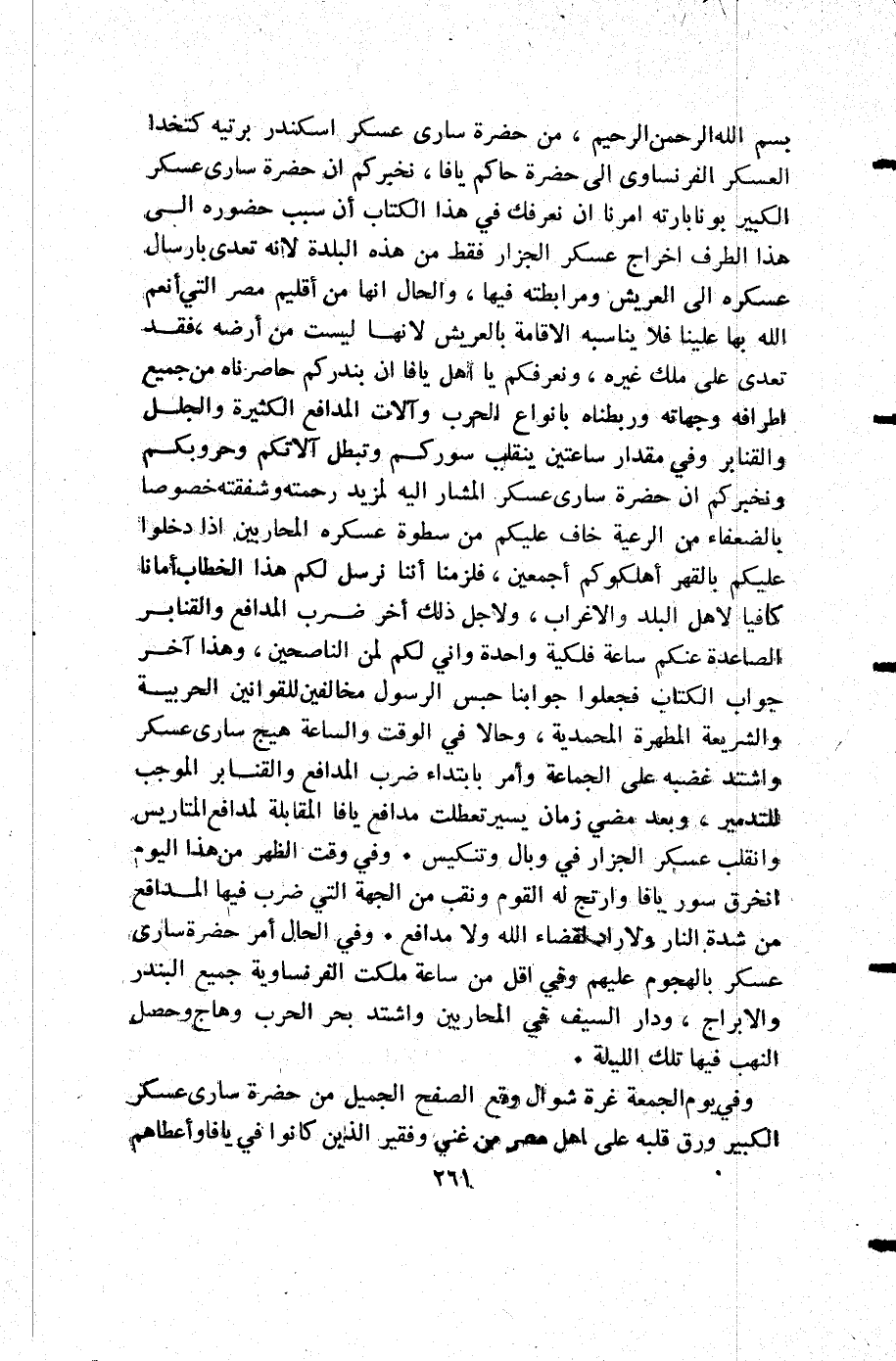 بسم الله الرحمن الرحيم من حضرة ساري عسكر اسكندر برتية كتخدا العسكر الفرنساوي الىحضرة حاكم يافا نخبركم أن حضرة ساري عسكر الكبير بونابارته امرنا أن نعرفك في هذا الكتاب أن سبب حضوره إلى هذا الطرف اخراج عسكر الجزار فقط من هذه البلدة لأنه تعدى بإرسال عسكره إلى العريش ومرابطته فيها والحال أنها من إقليم مصر التي أنعم الله بها علينا فلا يناسبه الإقامة بالعريش لانها ليس من أرضه فقد تعدى على ملك غيره ونعرفكم يا أهل يافا أن بندركم حاصرناه من جميع أطرافه وجهاته وربطناه بأنواع الحرب وآلات المدافع الكثيرة والجلل والقنابر وفي مقدرا ساعتين ينقلب سوركم وتبطل آلاتكم وحروبكم ونخبكرم أن حضرة ساري عسكر المشار إليه لمزيد رحمته وشفقته خصوصا بالضعفاء من الرعية خاف عليكم من سطوة عسكره المحاربين إذا دخلوا عليكم بالقهر أهلكوكم اجمعين فلزمنا أننا نرسل لكم هذا الخطاب أمانا كافيا لأهل البلد والأغراب ولأجل ذلك آخر ضرب المدافع والقنابر الصاعدة عنكم ساعة فلكية واحدة واني لكم لمن الناصحين وهذا آخر جواب الكتاب فجعلوا جوابنا حبس الرسول مخالفين للقوانين الحربية والشريعة المطهرة المحمدية وحالا في الوقت والساعة هيج سارى عسكر واشتد غضبه على الجماعة وأمر بابتداء ضرب المدافع والقنابر الموجب للتدمير وبعد مضي زمان يسير تعطلت مدافع يافا المقابلة لمدافع المتاريس وانقلب عسكر الجزار في وبال وتنكيس وفي وقت الظهر من هذا اليوم انخرق سور يافا وارتج له القوم ونقب من الجهة التي ضرب فيها المدافع من شدة النار ولا راد لقضاء الله ولا مدافع وفي الحال أمر حضرة ساري عسكر بالهجوم عليهم وفي أقل من ساعة ملكت الفرنساوية جميع البندر والابراج ودار السيف في المحاربين واشتد بحر الحرب وهاج وحصل النهب فيها تلك الليلة.