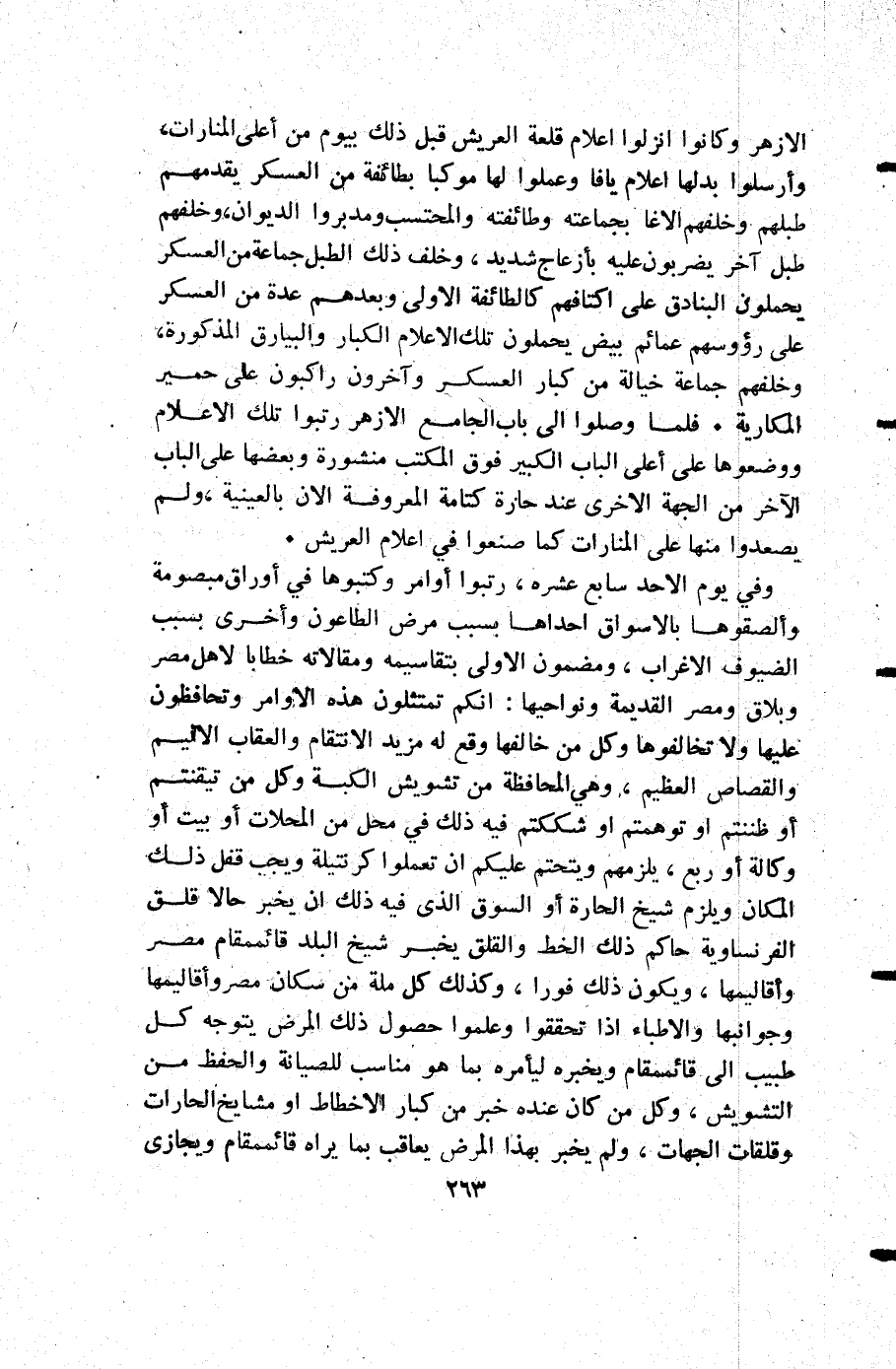 وفي يوم الأحد سابع عشره رتبوا أوامر وكتبوها في أوراق مبصومة والصقوها بالأسواق أحداها بسبب مرض الطاعون وأخرى بسبب الضيوف الاغراب ومضمون الأولى بتقاسيمه ومقالاته خطابا لأهل مصر وبلاق ومصر القديمة ونواحيها انكم تمتثلون هذه الأوامر وتحافظون عليها ولا تخالفوها وكل من خالفها وقع له مزيد من الانتقام والعقاب الاليم والقصاص العظيم وهي المحافظة من تشويش الكبة وكل من تيقنتم أو ظننتم أو توهمتم أو شككتم فيه ذلك في محل من المحلات أو بيت أو وكالة أو ربع يلزمهم ويتحتم عليكم أن تعملوا كرنتيلة ويجب قفل ذلك المكان ويلزم شيخ الحارة أو السوق الذي فيه ذلك أن يخبر حالا قلق الفرنساوية حاكم ذلك الخط القلق يخبر شيخ البلد قائمقام مصر وأقاليمها ويكون ذلك فورا وكذلك كل ملة من سكان مصر وأقاليمها وجوانبها والأطباء إذا تحققوا وعلموا حصول ذلك المرض يتوجه كل طبيب إلى قائمقام ويخبره ليأمر بما هو مناسب للصيانة والحفظ من التشويش وكل من كان عنده خبر من كبار الاخطاط أو مشايخ الحارات وقلقات الجهات ولم يخبر بهذا المرض يعاقب بما يراه قائمقام ويجازى