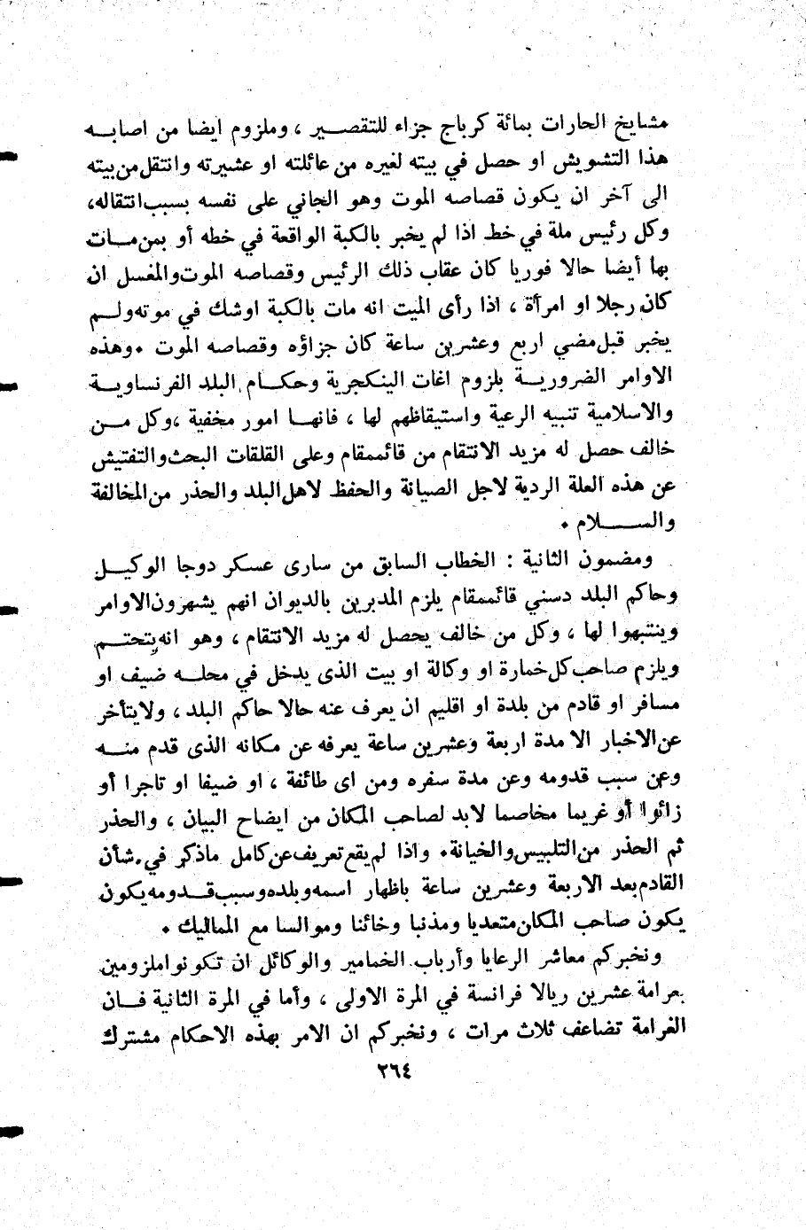 مشايخ الحارات بمائة كرباج جزاء للتقصير وملزوم أيضا من اصابه هذا التشويش أو حصل في بيته لغيره من عائلته أو عشيرته وانتقل من بيته إلى آخر أن يكون قصاصة الموت وهو الجاني على نفسه بسبب انتقاله وكل رئيس ملة في خط إذا لم يخبر بالكبة الواقعة في خطه أو بمن مات بها أيضا حالا فوريا كان عقاب ذلك الرئيس وقصاصة الموت والمغسل أن كان رجلا أو امرأة إذا رأى الميت أنه مات بالكبة اوشك في موته ولم يخبر قبل مضي أربع وعشرين ساعة كان جزاؤه وقصاصةالموت وهذه الاوامر الضرورية بلزوم اغات الينكجرية وحكام البلد الفرنساوية والإسلامية تنبيه الرعية واستيقاظهم لها فإنها أمور مخفية وكل من خألف حصل له مزيد من الانتقام من قائمقام وعلى القلقات البحث والتفتيش عن هذه العلة الردية لأجل الصيانة والحفظ لأهل البلد والحذر من المخالفة والسلام.