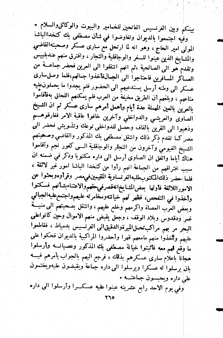 وفيه اجتمعوا الديوان وتفاوضوا في شأن مصطفى بك كتخدا الباشا المولى أمير الحاج وهو أنه لما ارتحل مع سارى عسكر وصحبته القاضي والمشايخ الذين عينوا للسفر والوجاقلية والتجار وافترق منهم عند بلبيس وتقدم هو إلى الصالحية ثم أنهم انتقلوا إلى العرين فحضر جماعة من العساكر المسافرين فاحتاجوا إلى الجمال فأخذوا جمالهم فلما واصل سارى عسكر إلى وطنه أرسل يستدعيهم إلى الحضور فلم يجدوا ما يحملون عليه متاعهم وبلغهم أن الطريق مخيفة من العرب فلم يمكنهم اللحاق به فأقاموا بالعرين بالعين المهملة عدة أيام وأهمل أمرهم سارى عسكر ثم أن الشيخ الصاوي والعريشي والدواخلي وآخرين خافوا عاقبة الأمر ففارقوهم وذهبوا إلى القرين بالقاف وحصل للدواخلي توعك وتشويش فحضر إلى مصر كما تقدم ذكر ذلك وانتقل مصطفى بك المذكور والقاضي وصحبتهم الشيخ الفيومي وآخرون من التجار والوجاقلية إلى كفور نجم وأقاموا هناك أياما واتفق أن الصاوي أرسل إلى داره مكتوبا وذكر في ضمنه أن سبب افتراقهم من الجماعة أنهم رأوا من كتخدا الباشا أمور غير لائقة فلماحضر ذلك المكتوب طلبه الفرنساوية المقيمين في مصر وقرأوه وبحثوا عن الأمور اللائقة فأولها بعض المشايخ أنه قصر في حقهم والأعتناء بشأنهم فسكتوا وأخذوا في التفحص فظهر لهم خيانته ومخامرته عليهم واجتمع عليه الجبالي وبعض العرب العصاة وأكرمهم وخلع عليهم وانتقل بصحبتهم إلى منية غمر ودقدوس وبلاد الوقف وجعل يقبض منهم الأموال وحين كانوا علىالبحر مر بهم مراكب تحمل الميرة والدقيق إلى الفرنسيس بدمياط فقاطعوا عليهم وأخذوا منهم ما معهم قهرا وأحضروا المراكبية بالديوان فحكوا على ما وقع لهم معه فأثبتوا خيانة مصطفى بك المذكور وعصيانه وأرسلوا هجانا بإعلام سارى عسكرهم بذلك فرجع إليهم بالجواب يأمرهم فيه بأن يرسلو له عسكرا ويرسلوا إلى داره جماعة ويقبضون عليه ويختمون على داره ويحبسون جماعته.