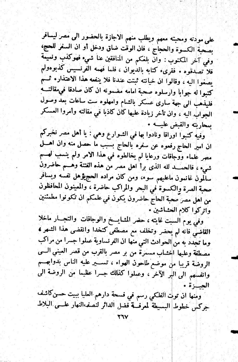 على مودته ومحبته معهم ويطلب منهم الاجازة بالحضور إلى مصر ليسافر بصحبة الكسوة والحجاج فإن الوقت ضاق ودخل أوان السفر للحج وفي آخر المكتوب وأن بلغكم من المنافقين عنا شيء فهو كذب ونميمة فلا تصدقوه فقرىء كتابه بالديوان فلما فهمه الفرنسيس كذبوه ولم يصغوا إليه وقالوا أن خيانته ثبتت عندنا فلا ينفعه هذا الأعتذار ثم كتبوا له جوابا وأرسلوه صحبة إمامه مضمونه أن كان صادقا في مقالته فليذهب إلى جهة سارى عسكر بالشام وامهلوه ست ساعات بعد وصول الجواب إليه وأن تأخر زيادة عليها كان كاذبا في مقالته وأمروا العسكر بمحاربته والقبض عليه.