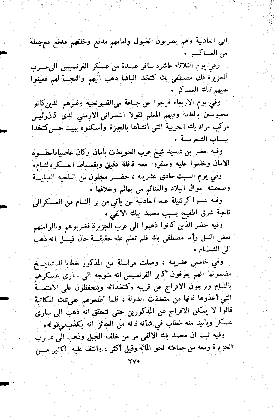 وفي خامس عشرينه وصلت مراسلة من المذكور خطابا للمشايخ مضمونها أنهم يعرفون أكابر الفرنسيس أنه متوجه إلى ساري عسكرهم بالشام ويرجون الافراج عن قريبه وكتخدائه ويتحفظون على الأمتعة التي أخذوها فإنها من متعلقات الدولة فلما أطلعوهم على تلك المكاتبة قالوا: لا يمكن الافراج عن المذكورين حتى تتحقق أنه ذهب إلى سارى عسكر ويأتينا منه خطاب في شأنه فإنه من الجائز أنه يكذب في قوله.