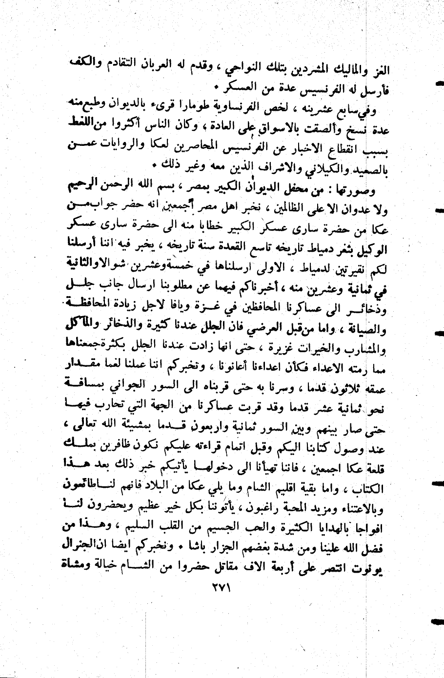 وصورتها من محفل الديوان الكبير بمصر بسم الله الرحمن الرحيم ولا عدوان إلا على الظالمين نخبر أهل مصر أجمعين أنه حضر جواب من عكا من حضرة ساري عسكر الكبير خطابا منه إلى حضرة ساري عسكر الوكيل بثغر دمياط تاريخه تاسع القعدة سنة تاريخه يخبر فيه اننا أرسلنا لكم نقيرتين لدمياط الأولى ارسلناها في خمسة وعشرين شوالا والثانية في ثمانية وعشرين منه أخبرناكم فيهما عن مطلوبنا إرسال جانب جليل وذخائر إلى عساكرنا المحافظين في غزة ويافا لأجل زيادة المحافظة والصيانة وأما من قبل العرضي فإن الجلل عندنا كثيرة والذخائر والمآكل والمشارب والخيرات غزيرة حتى أنها زادت عندنا الجلل بكثرة جمعناها مما رمته الأعداء فكأن اعداءنا أعانونا وتخبركم اننا عملنا لغما مقدار عمقه ثلاثون قدما وسرنا به حتى قربناه إلى السور الجواني بمسافة نحو ثمانية عشر قدما وقد قربت عساكرنا من الجهة التي تحارب فيها حتى صار بينهم وبين السور ثمانية وأربعون قدما بمشيئة الله تعالى عند وصول كتابنا اليكم وقبل إتمام قراءته عليكم نكون ظافرين بملك قلعة عكا اجمعين فاننا تهيأنا إلى دخولها يأتيكم خبر ذلك بعد هذا الكتاب وأما بقية إقليم الشام وما يلي عكا من البلاد فإنهم لنا طائعون وبالاعتناء ومزيد المحبة راغبون يأتوننا بكل خير عظيم ويحضرون لنا افواجا بالهدايا الكثيرة والحب الجسيم من القلب السليم وهذا من فضل الله علينا ومن شدة بغضهم الجزار باشا ونخبركم أيضا أن الجنرال يونوت انتصر على أربعة آلاف مقاتل حضروا من الشام خيالة ومشاة