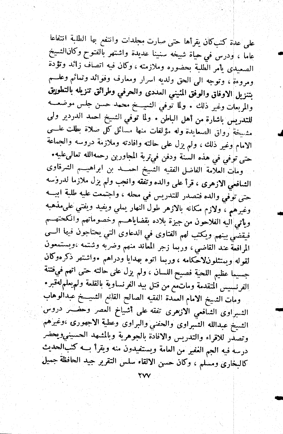 ومات العلامة الفاضل الفقيه الشيخ أحمد بن إبراهيم الشرقاوي الشافعي الأزهري قرأ على والده وتفقه وانجب ولم يزل ملازما لدروسه حتى توفي والده فتصدر للتدريس في محله واجتمعت عليه طلبة ابيه وغيرهم ولازم مكانه بالأزهر طول النهار يملي ويفيد ويفتي على مذهبه ويأتي إليه الفلاحون من جيزة بلادهم بقضاياهم وخصوماتهم وانكحتهم فيقضي بنيهم ويكتب لهم الفتاوي في الدعاوي التي يحتاجون فيها إلى المرافعة عند القاضي وربما زجر المعاند منهم وضربه وشتمه ويستمعون لقوله ويمتثلون لاحكامه وربما اتوه بهدايا ودراهم واشتهر ذكره وكان جسيما عظيم اللحية فصيح اللسان ولم يزل على حالته حتى اتهم في فتنة الفرنسيس المتقدمة ومات مع من قتل بيد الفرنساوية بالقلعة ولم يعلم له قبر.