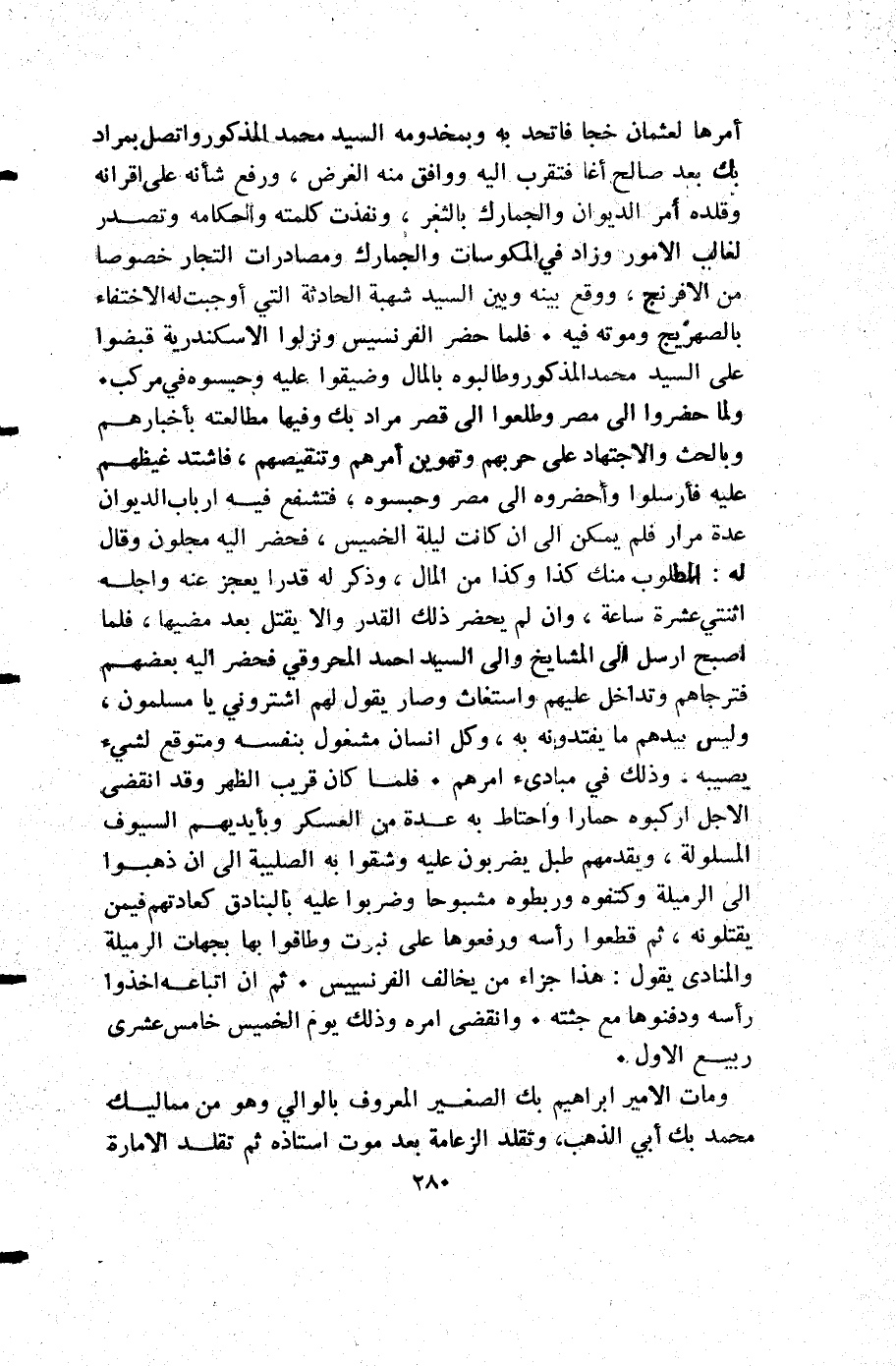 أمرها لعثمان خجا فاتحد وبمخدومه السيد محمد المذكور واتصل بمراد بك بعد صالح أغا فتقرب إليه ووافق منه الغرض ورفع شأنه على اقرانه وقلده أمر الديوان والجمارك بالثغر ونفذت كلمته واحكامه وتصدر لغالب الأمور وزاد في المكوسات والجمارك ومصادرات التجار خصوصا من الإفرنج ووقع بينه وبين السيد شهبة الحادثة التي أوجبت له الاختفاء بالصهريج وموته فيه فلما حضر الفرنسيس ونزلوا الأسكندرية قبضوا على السيد محمد المذكور وطالبوه بالمال وضيقوا عليه وحبسوه في مركب ولما حضروا إلى مصر وطلعوا إلى قصر مراد بك وفيها مطالعته بأخبارهم وبالحث والاجتهاد على حربهم وتهوين أمرهم وتنقيصهم فاشتد غيظهم عليه فأرسلوا وأحضروه إلى مصر وحبسوه فتشفع فيه أرباب الديوان عدة مرار فلم يمكن إلى أن كانت ليلة الخميس فحضر إليه مجلون وقال له المطلوب منك كذا وكذا من المال وذكر له قدرا يعجز عنه واجله اثنتي عشرة ساعة وأن لم يحضر ذلك القدر والا يقتل بعد مضيها فلما أصبح أرسل إلى المشايخ وإلى السيد أحمد المحروقي فحضر إليه بعضهم فترجاهم وتداخل عليهم واستغاث وصار يقول لهم اشتروني يا مسلمون وليس بيدهم ما يفتدونه به وكل إنسان مشغول بنفسه ومتوقع لشيء يصيبه وذلك في مبادىء أمرهم فلما كان قريب الظهر وقد انقضى الأجل اركبوه حمارا واحتاط به عدة من العسكر وبأيديهم السيوف المسلولة ويقدمهم طبل يضربون عليه وشقوا به الصليبة إلى أن ذهبوا إلى الرميلة وكتفوه وربطوه مشبوحا وضربوا عليه بالبنادق كعادتهم فيمن يقتلونه ثم قطعوا رأسه ورفعوها على نبرت وطافوا بها بجهات الرميلة والمنادى يقول هذا جزاء من يخألف الفرنسيس ثم أن اتباعه أخذوا رأسه ودفنوها مع جثته وانقضى أمره وذلك يوم الخميس خامس عشرى ربيع الأول.