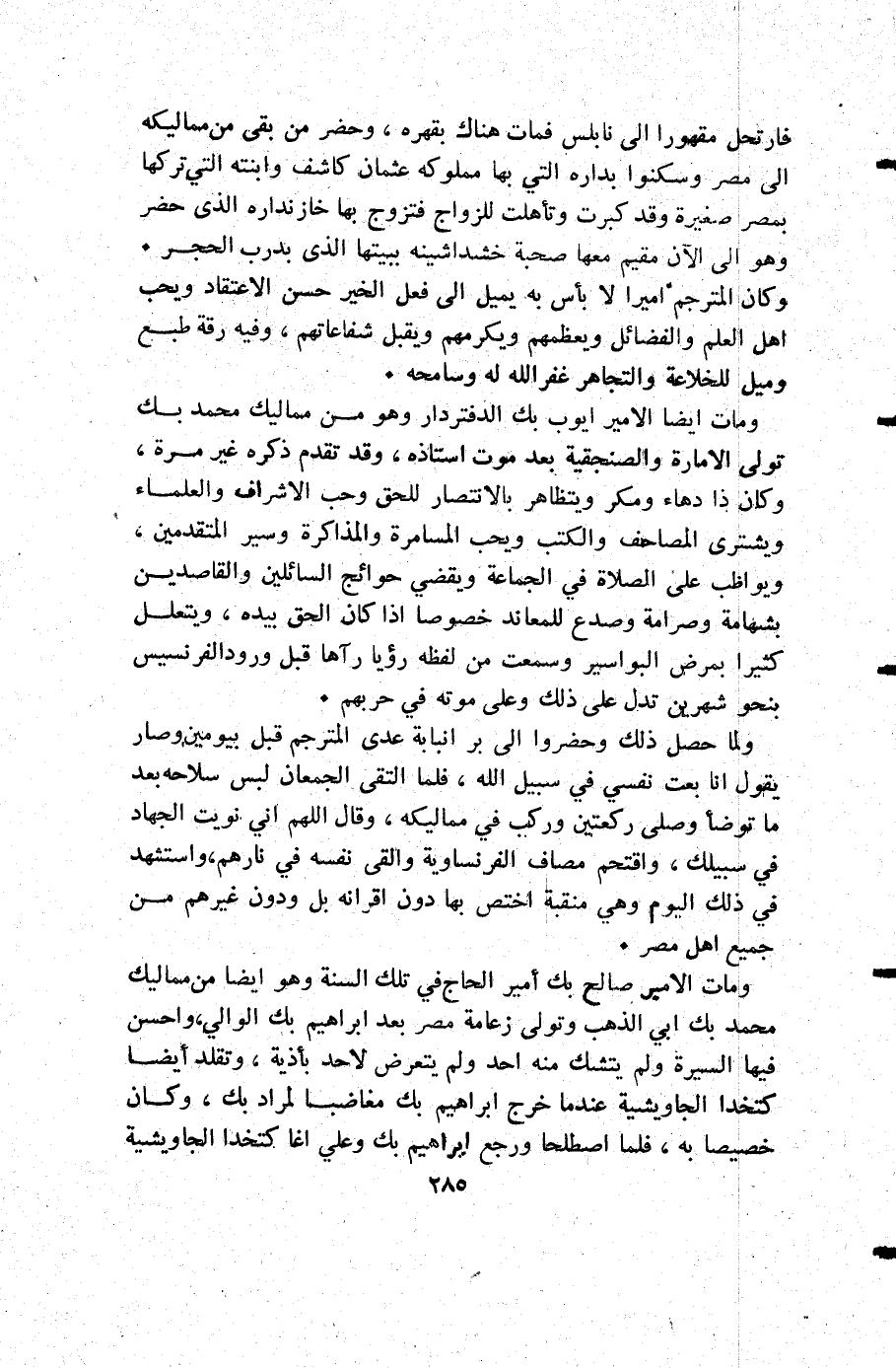 ومات أيضا الأمير أيوب بك الدفتردار وهو من مماليك محمد بك تولى الأمارة والصنجقية بعد موت أستاذه وقد تقدم ذكره غير مرة وكان ذا دهاء ومكر ويتظاهر بالانتصار للحق وحب الأشراف والعلماء ويشتري المصاحف والكتب ويحب المسامرة والمذاكرة وسير المتقدمين ويواظب على الصلاة في الجماعة ويقضي حوائج السائلين والقاصدين بشهامة وصرامة وصدع للمعاند خصوصا إذا كان الحق بيده ويتعلل كثير بمرض البواسير وسمعت من لفظه رؤيا رآها قبل ورود الفرنسيس بنحو شهرين تدل على ذلك وعلى موته في حربهم.
