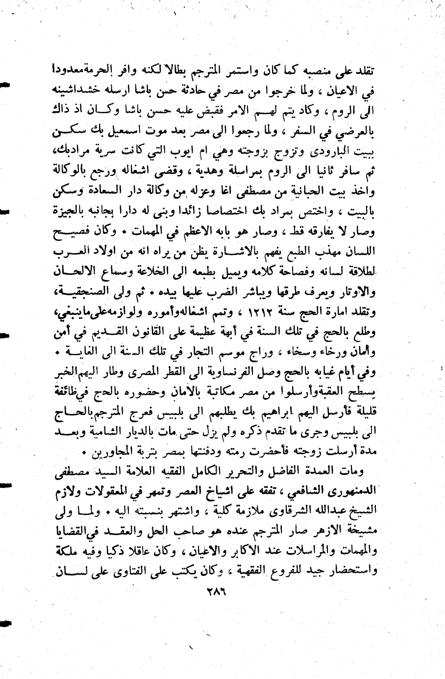 تقلد على منصبه كما كان واستمر المنترجم بطالا لكنه وافر الحرمة معدودا في الأعيان ولما خرجوا من مصر في حادثة حسن باشا ارسله خشداشينه إلى الروم وكاد يتم لهم الأمر فقبض عليه حسن باشاوكان إذ ذاك بالعرضي في السفر ولما رجعوا إلى مصر بعد موت إسمعيل بك سكن ببيت البارودي وتزوج بزوجته وهي أم أيوب التي كانت سرية مراد بك ثم سافر ثانيا إلى الروم بمراسلة وهدية وقضى اشغاله ورجع بالوكالة وأخذ بيت الحبانية من مصطفى اغا وعزله من وكالة دار السعادة وسكن بالبيت واختص بمراد بك اختصاصا زائدا وبنى له دار بجانبه بالجيزة وصار لا يفارقه قط وصار هو بابه الأعظم في المهمات وكان فصيح اللسان مهذب الطبع يفهم بالاشارة يظن من يراه أنه من أولاد العرب لطلاقة لسانه وفصاحة كلامه ويميل بطبعه إلى الخلاعة وسماع الالحان والأوتار ويعرف طرقها ويباشر الضرب عليها بيده ثم ولى الصنجقية وتقلد امارة الحج سنة 1212 وتمم اشغاله وأموره ولوازمه على ما ينبغي وطلع بالحج في تلك السنة في أبهة عظيمة على القانون القديم في أمن وأمان ورخاء وسخاء وراج موسم التجار في تلك السنة إلى الغاية.