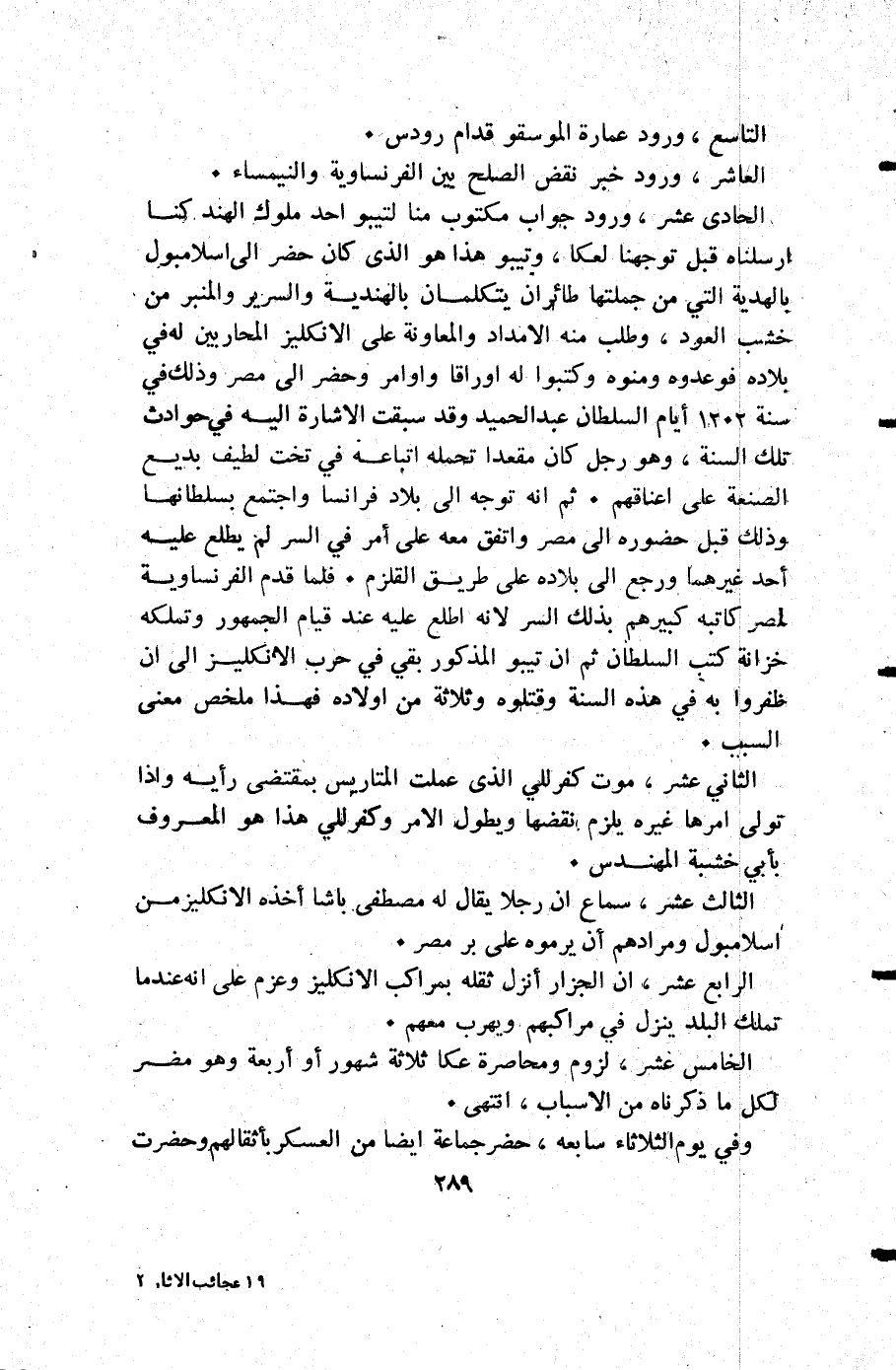 الحادي عشر: ورود جواب مكتوب منا لتيبو أجد ملوك الهند كنا ارسلناه قبل توجهنا لعكا وتيبوا هذا هو الذي كان حضر إلى اسلامبول بالهدية التي من جملتها طائران يتكلمان بالهندية والسرير والمنبر من خشب العود وطلب منه الأمداد والمعاونة على الانكليز المحاربين له في بلاده فوعدوه ومنوه وكتبوا له أوراقا وأوامر وحضر إلى مصر وذلك في سنة 1202 أيام السلطان عبد الحميد وقد سبقت الإشارة إليه في حوادث تلك السنة وهو رجل كان مقعدا تحمله اتباعه في تخت لطيف بديع الصنعة على اعناقهم ثم إنه توجه إلى بلاد فرنسا واجتمع بسلطانها وذلك قبل حضوره إلى مصر واتفق معه على أمر في السر لم يطلع عليه أجد غيرهما ورجع إلى بلاده على طريق القلزم فلما قدم الفرنساوية لمصر كاتبه كبيرهم بذلك السر لأنه اطلع عليه عند قيام الجمهور وتملكه خزانة كتب السلطان ثم أن تيبوا المذكور بقي في حرب الانكليز إلى أن ظفروا به في هذه السنة وقتلوه وثلاثة من أولاده فهذا ملخص معنى السبب.