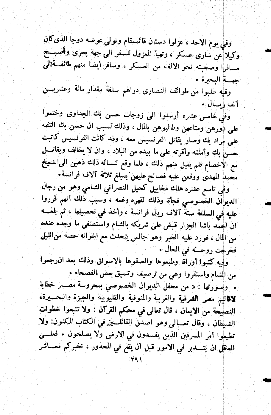 وصورتها من محفل الديوان الخصوصي بمحروسة مصر خطابا لأقاليم مصر الشرقية والغربية والمنوفية والقليوبية والجيزة والبحيرة النصيحة من الإيمان قال تعالى في محكم القرآن: {وَلا تَتَّبِعُوا خُطُوَاتِ الشَّيْطَانِ} وقال تعالى وهو أصدق القائلين في الكتاب المكنون: {وَلا تُطِيعُوا أَمْرَ الْمُسْرِفِينَ, الَّذِينَ يُفْسِدُونَ فِي الْأَرْضِ وَلا يُصْلِحُونَ} فعلى العاقل يتدبر في الأمور قبل أن يقع في المحذور نخبركم معاشر.