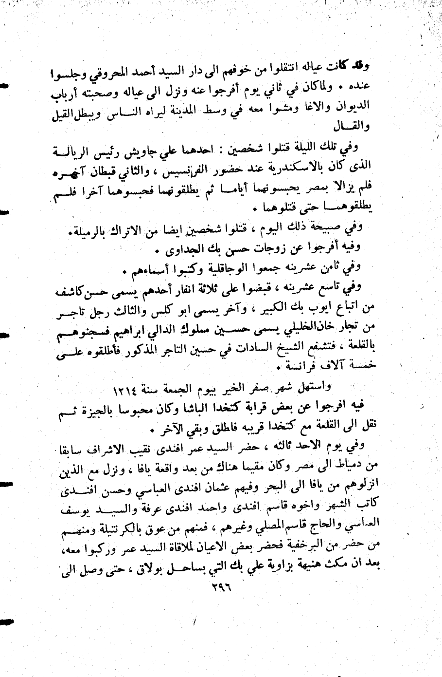 وفي تاسع عشرينه قبضوا على ثلاثة انفار أحدهم يسمى حسن كاشف من اتباع أيوب بك الكبير وآخر يسمى أبو كلس والثالث رجل تاجر من تجار خان الخليلي يسمى حسين مملوك الدالي إبراهيم فسجنوهم بالقلعة فتشفع الشيخ السادات في حسين التاجر المذكور فأطلقوه على خمسة آلاف فرانسة.