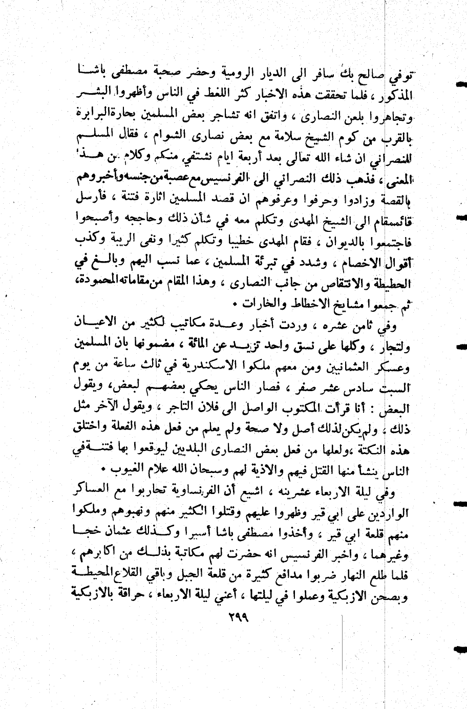 توفي صالح بك سافر إلى الديار الرومية وحضر صحبة مصطفى باشاالمذكور فلما تحققت هذه الأخبار كثر اللغط في الناس وأظهروا البشر وتجاهروا بلعن النصارى واتفق أنه تشاجر بعض المسلمين بحارة البرابرة بالقرب من كوم الشيخ سلامة مع بعض نصارى السوام فقال المسلم للنصراني إن شاء الله تعالى بعد أربعة أيام نشتقي منكم وكلام من هذا المعنى فذهب ذلك النصراني إلى الفرنسيس مع عصبة من جنسه واخبروهم بالقصة وزادوا وحرفوا وعرفوهم أن قصد المسلمين اثارة فتنة فأرسل قائممقام إلى الشيخ المهدي وتكلم معه في شأن ذلك وحاججه وأصبحوا فأجتمعوا بالديوان فقام المهدي خطيبا وتكلم كثيرا ونفى الريبة وكذب أقوال الاخصام وشدد في تبرئة المسلمين عما نسب إليهم وبالغ في الحطيطة والانتقاص من جانب النصارى وهذا المقام من مقاماته المحمودة ثم جمعوا مشايخ الاخطاط والحارات.