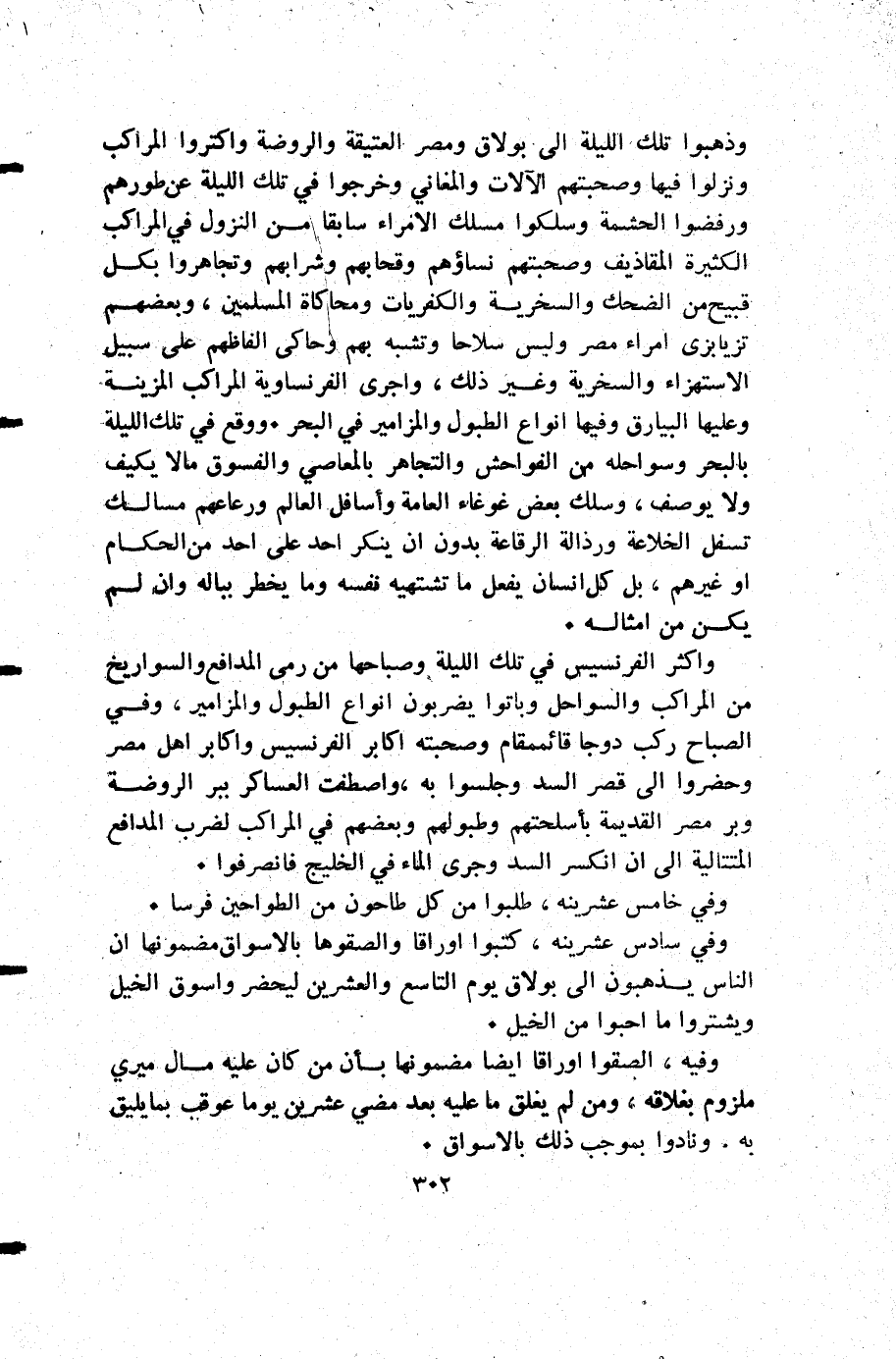 وذهبوا تلك الليلة إلى بولاق ومصر العتيقة والروضة وأكثروا المراكب ونزلوا فيها وصحبتهم الآلات والمغاني وخرجوا في تلك الليلة عن طورهم ورفضوا الحشمة وسلكوا مسلك الأمراء سابقا من النزول في المراكب الكثيرة المقاذيف وصحبتهم نساؤهم وقحابهم وشرابهم وتجاهروا بكل قبيح من الضحك والسخرية والكفريات ومحاكاة المسلمين وبعضهم تزيابزي أمراء مصر وليس سلاحا وتشبه بهم وحاكى الفاظهم على سبيل الأستهزاء والسخرية وغير ذلك وأجرى الفرنساوية المراكب المزينة وعليها البيارق وفيها أنواع الطبول والمزامير في البحر ووقع في تلك الليلة بالبحر وسواحله من الفواحش والتجاهر بالمعاصي والفسوق ما لا يكيف ولا يوصف وسلك بعض غوغاء العامة وأسافل العلام ورعاعهم مسالك تسفل الخلاعة ورذالة الرقاعة بدون أن ينكر أجد على أجد من الحكام أو غيرهم بل كل إنسان يفعل ما تشتهيه نفسه وما يخطر بباله وأن لم يكن من أمثاله.