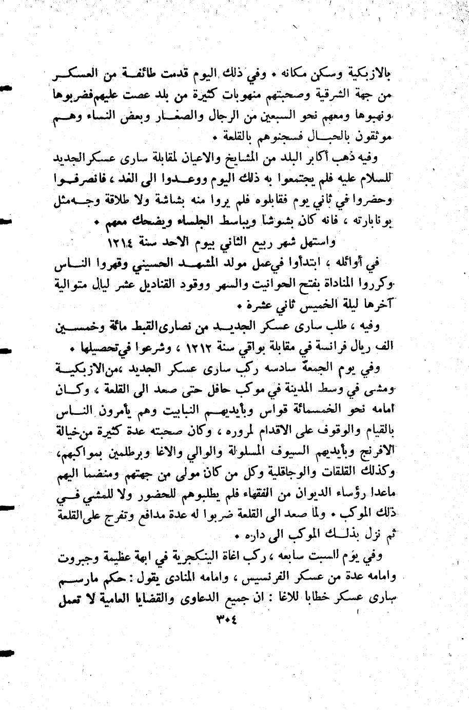 وفي يوم السبت سابعه ركب اغاة الينكجرية في ابهة عظيمة وجبروت وإمامه عدة من عسكر الفرنسيس وإمامه المنادى يقول حكم مارسم سارى عسكر خطابا للاغا أن جميع الدعاوى والقضايا العامية لا تعمل