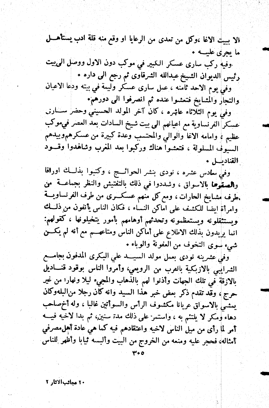 وفي عشرينه نودى بعمل مولد السيد علي البكري المدفون بجامع الشرايبي بالازبكية بالقرب من الرويعي وأمروا الناس بوقود قناديل بالازقة في تلك الجهات وأذنوا لهم بالذهاب والمجيء ليلا ونهارا من غير حرج وقد تقدم ذكر بعض خبر هذا السيد وأنه كان رجلا من البله وكان يمشي بالأسواق عريانا مكشوف الرأس والسوأتين غالبا وله أخ صاحب دهاء ومكر لا يلتئم به واستمر على ذلك مدة سنين ثم بدا لأخيه في أمر لما رأى من ميل الناس لأخيه واعتقادهم فيه كما هي عادة أهل مصر في أمثاله فحجر عليه ومنعه من الخروج من البيت وألبسه ثيابا وأظهر للناس