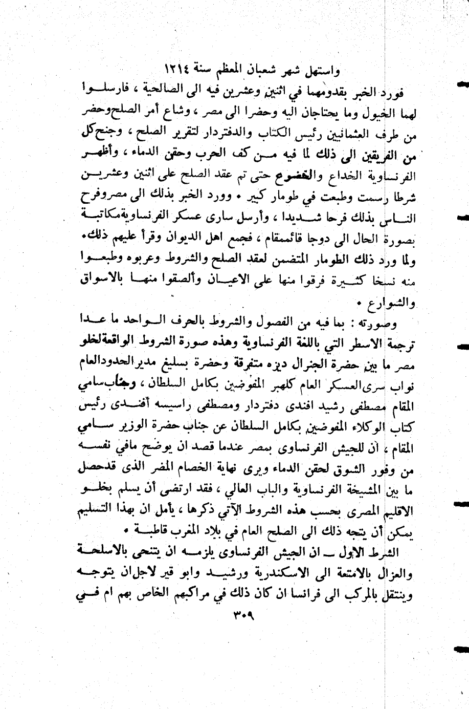 وصورته بما فيه من الفصول والشروط بالحرف الواحد ما عدا ترجمة الأسطر التي باللغة الفرنساوية وهذه صورة الشروط الواقعة لخلو مصر ما بين حضرة الجنرال ديزة متفرقة وحضرة بسليغ مدير الحدود العام نواب سرى العسكر العام كلهبر المفوضين بكامل السلطان وجناب سامي المقام مصطفى رشيد أفندي دفتردار ومصطفى راسيسه أفندي رئيس كتاب الوكلاء المفوضين بكامل السلطان عن جناب حضرة الوزير سامي المقام أن للجيش الفرنساوي بمصر عندما قصد أن يوضح ما في نفسه من وفور الشوق لحقن الدماء ويرى نهاية الخصام المضر الذي قد حصل ما بين المشيخة الفرنساوية والباب العالي فقد ارتضى أن يسلم بخلو الإقليم المصري بحسب هذه الشروط الآتي ذكرها يأمل أن بهذا التسليم يمكن أن يتجه ذلك إلى الصلح العام في بلاد المغرب قاطبة.