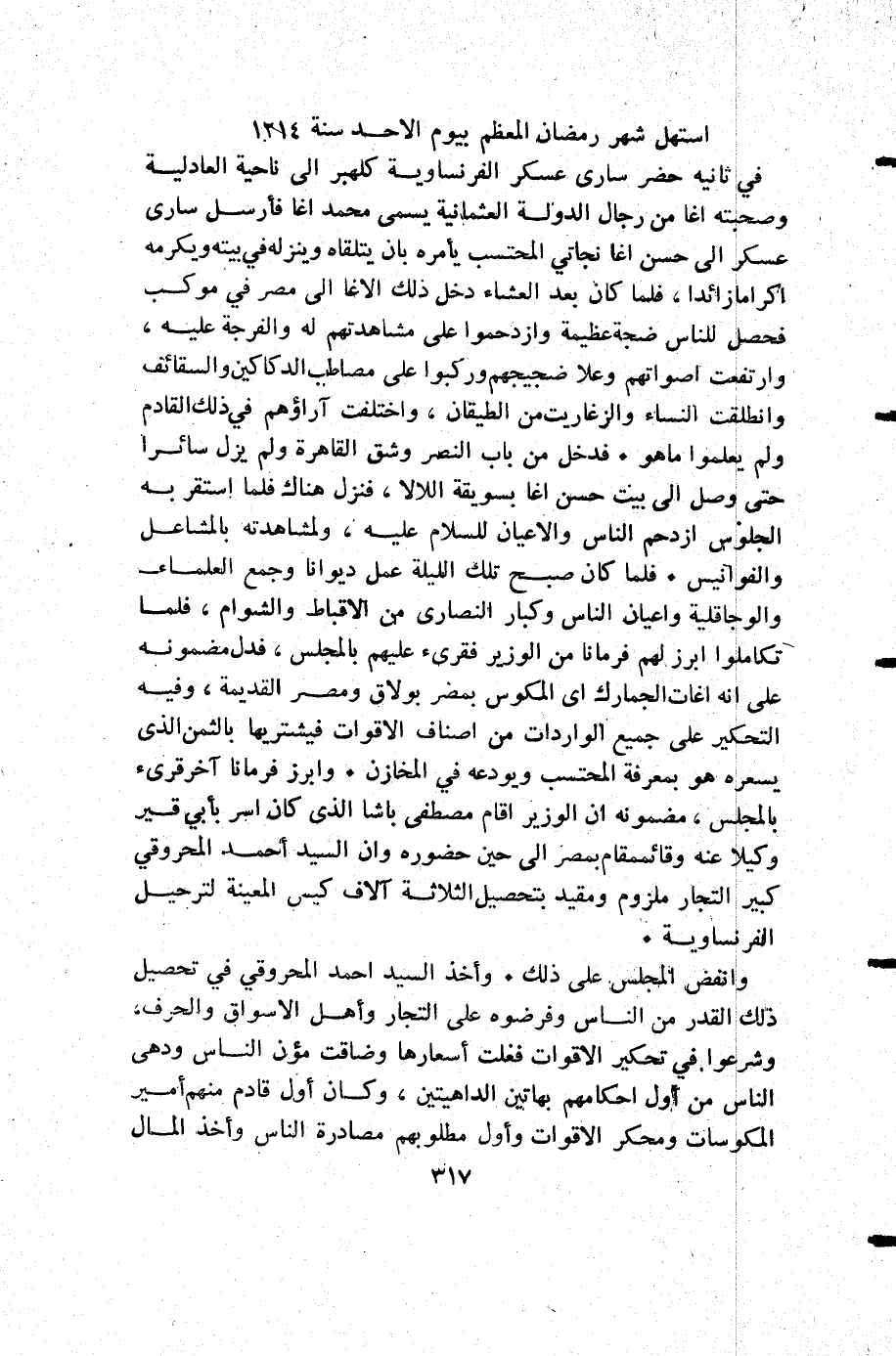 في ثانيه حضر سارى عسكر الفرنساوية كلهبر إلى ناحية العادلية وصحبته اغا من رجال الدولة العثمانية يسمى محمد اغا فأرسل سارى عسكر إلى حسن اغا نجاتي المحتسب يأمره بأن يتلقاه وينزله في بيته ويكرمه إكراما زائدا فلما كان بعد العشاء دخل ذلك الاغا إلى مصر في موكب فحصل للناس ضجة عظيمة وازدحموا على مشاهدتهم له والفرجة عليه وارتفعت أصواتهم وعلا ضجيجهم وركبوا على مصاطب الدكاكين والسقائف وانطلقت النساء والزغاريت من الطيقان واختلفت آراؤهم في ذلك القادم ولم يعلموا ما هو فدخل من باب النصر وشق القاهر ولم يزل سائرا حتى وصل إلى بيت حسن اغا بسويقة اللالا فنزل هناك فلما استقر به الجلوس ازدحم الناس والأعيان للسلام عليه ولمشاهدته بالمشاعل والفوانيس فلما كان صبح تلك الليلة عمل ديوانا وجمع العلماء والوجاقلية وأعيان الناس وكبار النصارى من الاقباط والشوام فلما تكاملوا أبرز لهم فرمانا من الوزير فقرىء عليهم بالمجلس فدل مضمونه على أنه اغات الجمارك أي المكوس بمصر بولاق ومصر القديمة وفيه التحكير على جميع الواردات من أصناف الأقوات فيشتريها بالثمن الذي يسعره هو بمعرفة المحتسب ويودعه في المخازن وابرز فرمانا آخر قرى بالمجلس مضمونه أن الوزير أقام مصطفى باشا الذي كان اسر بأبي قير وكيلا عنه وقائممقام بمصر إلى حين حضوره وأن السيد أحمد المحروقي كبير التجار ملزوم ومقيد بتحصيل الثلاثة آلاف كيس المعينة لترحيل الفرنساوية.