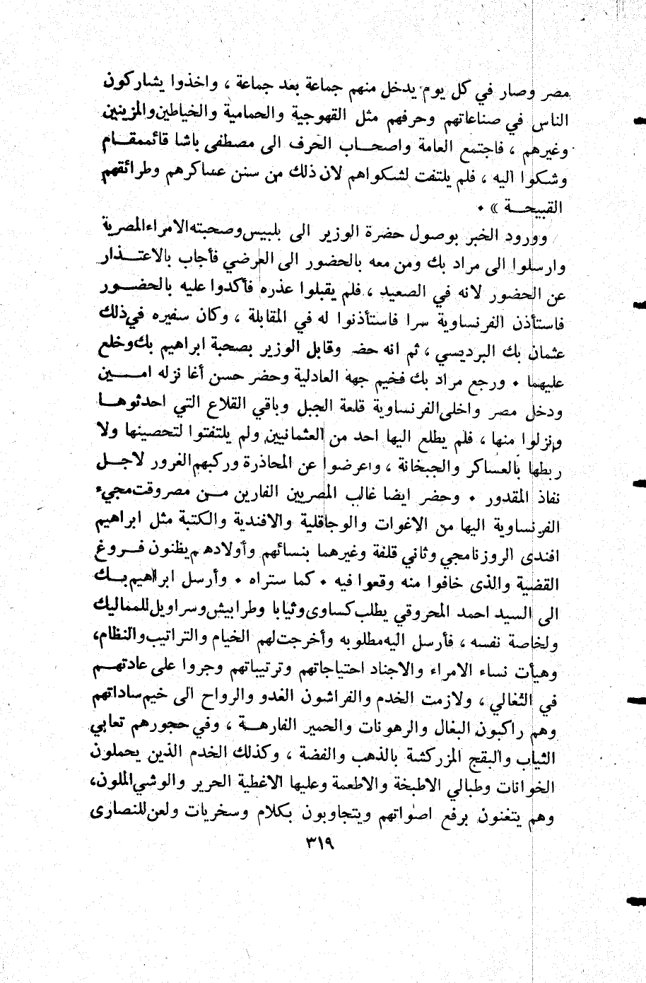 وورود الخبر بوصول حضرة الوزير إلى بلبيس وصحبته الأمراء المصرية وأرسلوا إلى مراد بك ومن معه بالحضور إلى العرضي فأجاب بالاعتذار عن الحضور لأنه في الصعيد فلم يقبلوا عذره فأكدوا عليه بالحضور فاستاذن الفرنساوية سرا فأستاذ نوا له في المقابلة وكان سفيره في ذلك عثمان بك البرديسي ثم إنه حضر وقابل الوزير بصحبة إبراهيم بك وخلع عليهما ورجع مراد بك فخيم جهة العادلية وحضر حسن أغا نزله أمين ودخل مصر واخلى الفرنساوية قلعة الجبل وباقي القلاع التي احدثوها ونزلوا منها فلم يطلع إليها أجد من العثمانيين ولم يلتفتوا لتحصينها ولا ربطها بالعساكر والجبخانة وأعرضوا عن المحاذرة وركبهم الغرور لأجل نفاذ المقدور وحضر أيضا غالب المصريين الفارين من مصر وقت مجيء الفرنساوية إليها من الاغوات والوجاقلية والافندية والكتبة مثل إبراهيم أفندي الروزنامجي وثاني قلفة وغيرهما بنسائهم وأولادهم يظنون فروغ القضية والذي خافوا منه وقعوا فيه كما ستراه وأرسل إبراهيم بك إلى السيد أحمد المحروقي يطلب كساوى وثيابا وطرابيش وسراويل للمماليك ولخاصة نفسه فأرسل إليه مطلوبه وأخرجت لهم الخيام والتراتيب والنظام وهيأت نساء الأمراء والأجناد احتياجاتهم وترتيباتهم وجروا على عادتهم في الثغالى ولازمت الخدم والفراشون الغدو والرواح إلى خيم ساداتهم وهم راكبون البغال والرهونات والحمير الفارهة وفي حجورهم تعابي الثياب والبقج المزركشة بالذهب والفضة وكذلك الخدم الذين يحملون الخوانات وطبالي الأطبخة والأطعمة وعليها الأغطية الحرير والوشي الملون وهم يتغنون برفع أصواتهم ويتجاوبون بكلام وسخريات ولعن للنصارى