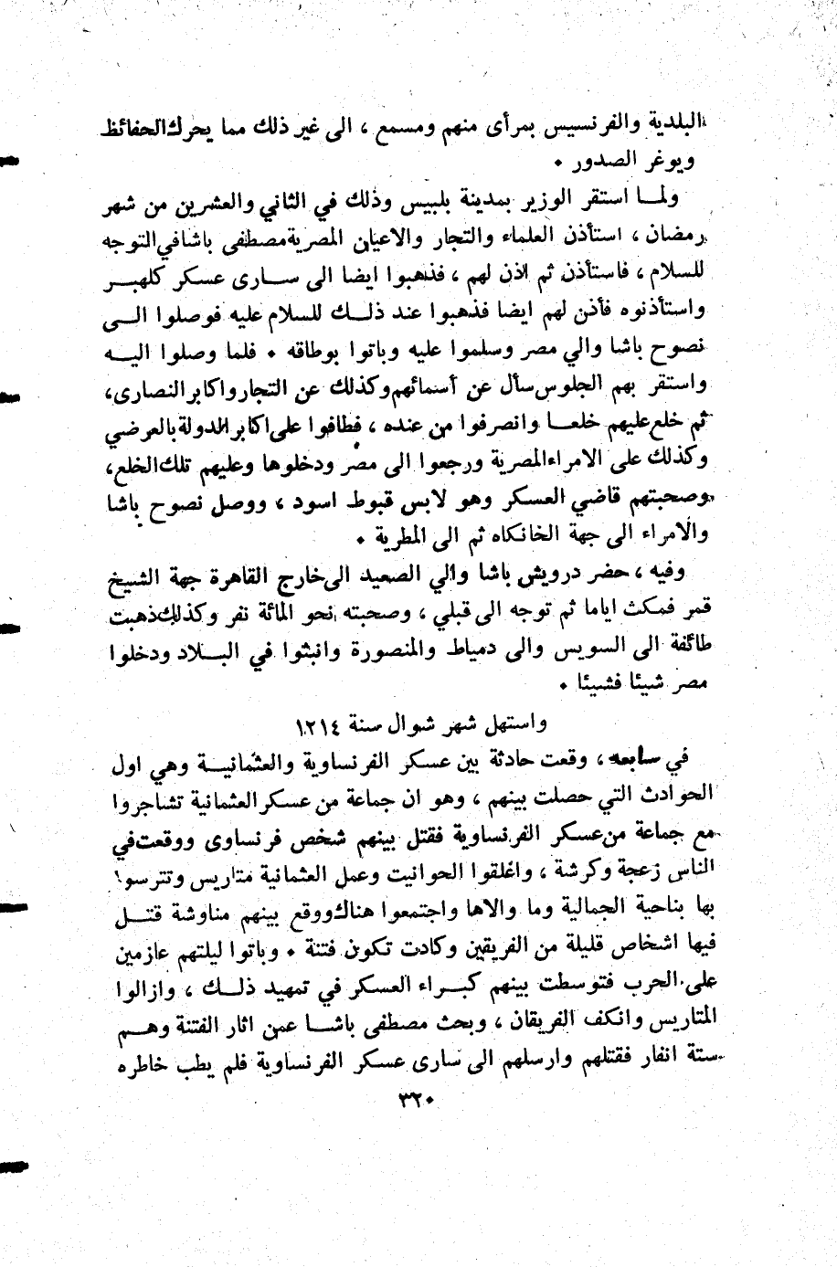 في سابعه وقعت حادثة بين عسكر الفرنساوية والعثمانية وهي أول الحوادث التي حصلت بينهم وهو أن جماعة من عسكر العثمانية تشاجروا مع جماعة من عسكر الفرنساوية فقتل بينهم شخص فرنساوي ووقعت في الناس زعجة وكرشة وأغلقوا الحوانيت وعمل العثمانية متاريس وتترسوا بها بناحية الجمالية وما والاها واجتمعوا هناك ووقع بينهم مناوشة قتل فيها أشخاص قليلة من الفريقين وكادت تكون فتنة وباتوا ليلتهم عازمين على الحرب فتوسطت بينهم كبراء العسكر في تمهيد ذلك وإزالوا المتاريس وانكف الفريقان وبحث مصطفى باشا عمن اثار الفتنة وهم ستة انفار فقتلهم وأرسلهم إلى سارى عسكر الفرنساوية فلم يطب خاطره